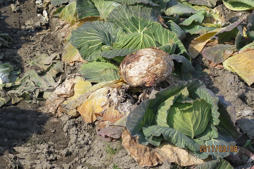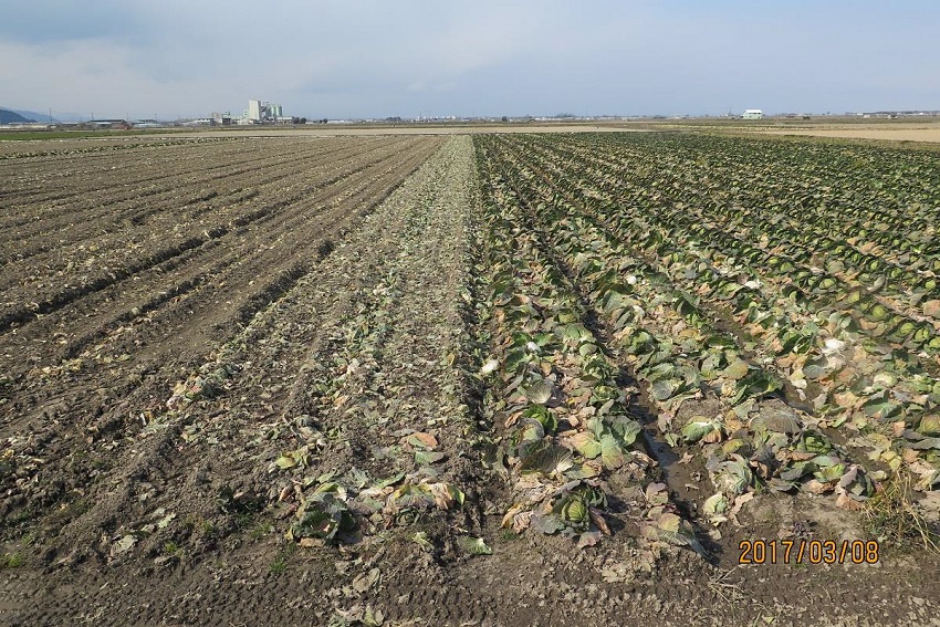 ほとんどが小玉の株である。 (撮影3月8日:大中の湖、収穫終了時期) ・中上段:直径15cm程度の小玉株が目立つ。 (撮影3月8日:大中の湖) ・中下段:菌核病に侵された株(撮影3月8日) ・下段:写真左側の圃場から右側へ、早生〜中生〜晩生の品種が作付され、収穫後耕耘されている。 右側の圃場のみが残っている。(撮影3月8日:大中の湖) | ||||||