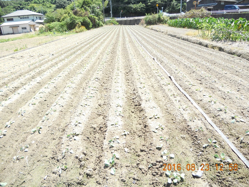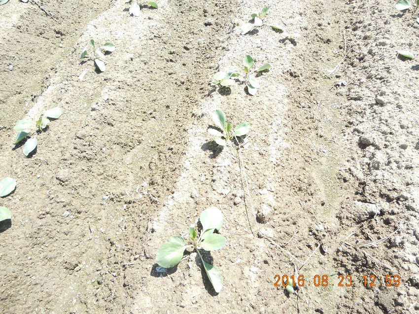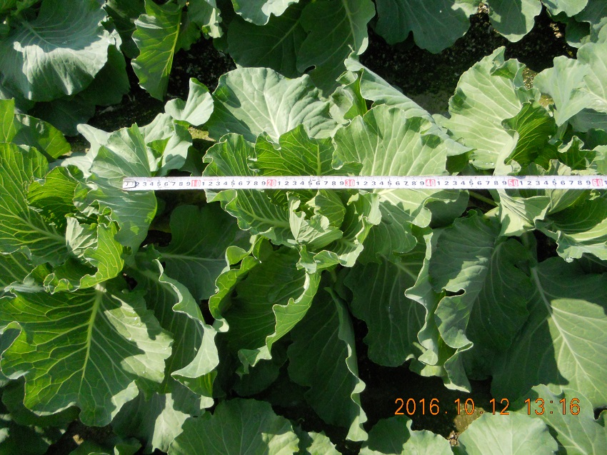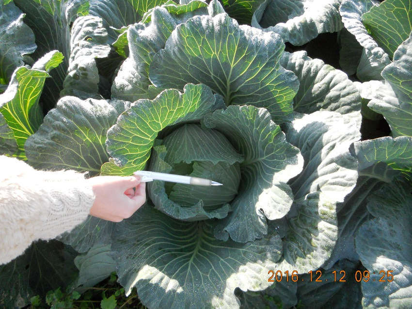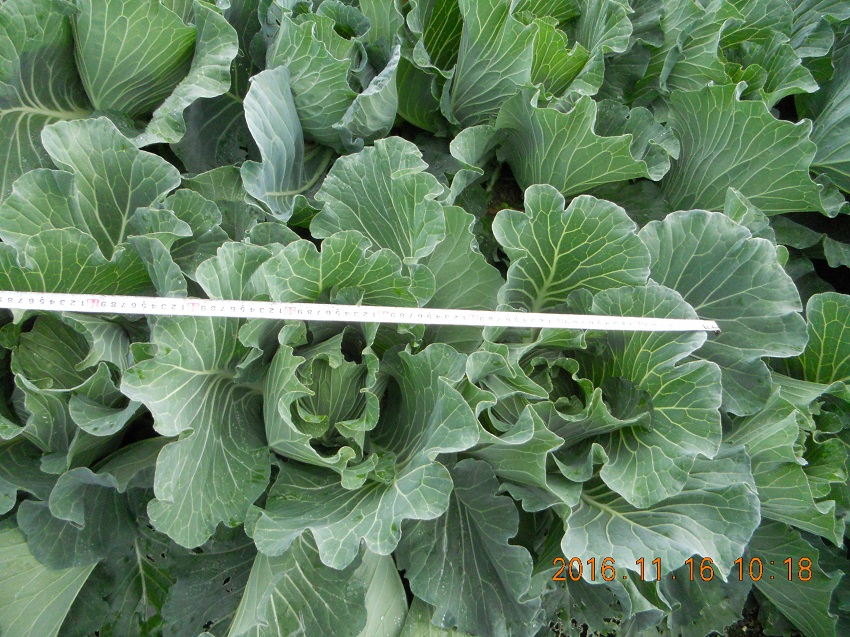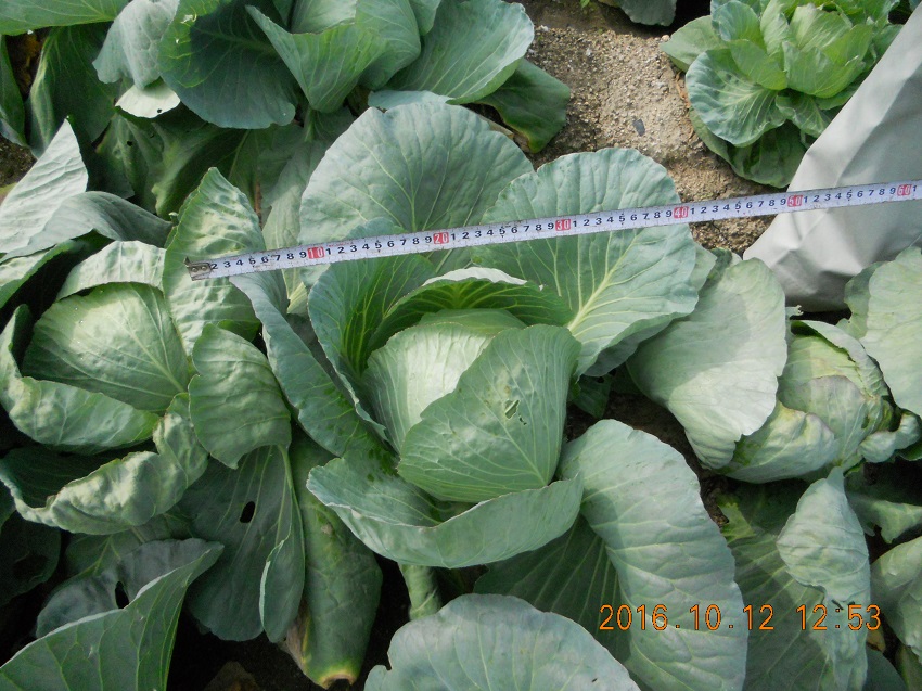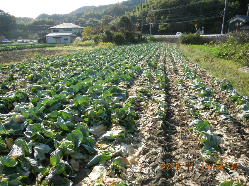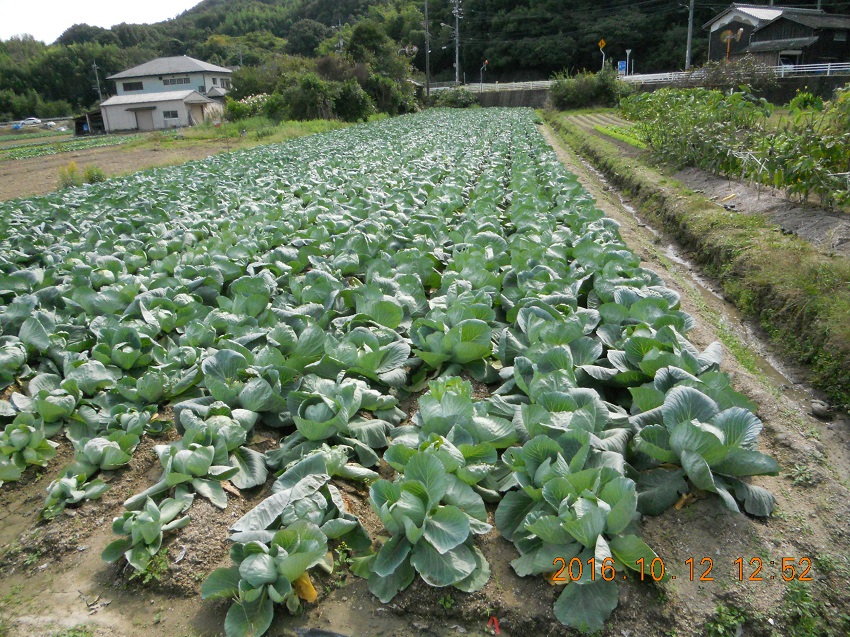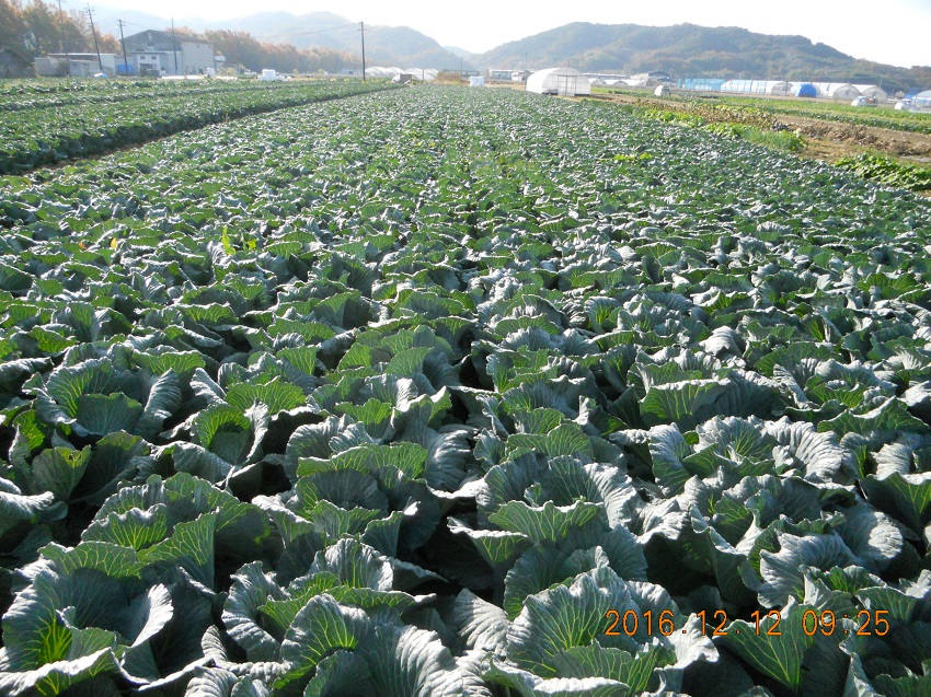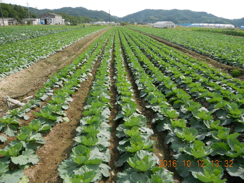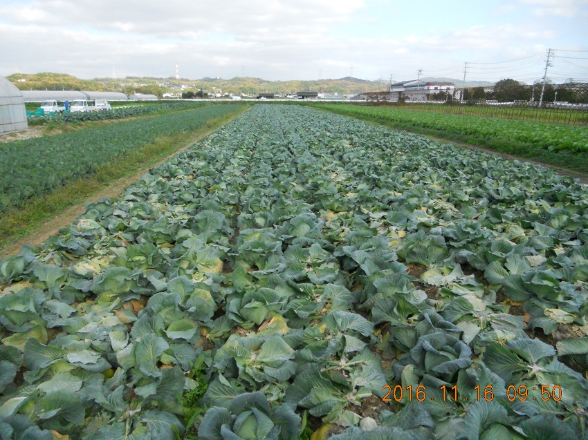 9月の曇雨天、大雨の影響により、若干生育にむらがあり、病気の発生もある。 ・中上段:11月収穫のキャベツ。 玉の肥大は順調。 ・中下段:9月中旬定植の圃場。 病害虫の発生もなく、順調に生育中。 ・下段:同上。 結球はじめ。 | ||||||