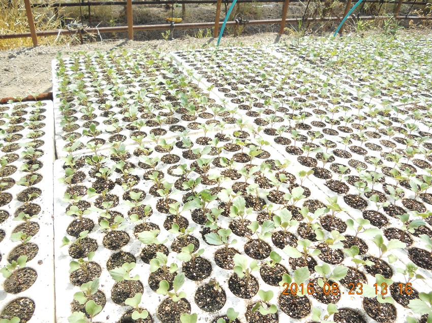 ・中下段:播種から2週間経過の苗。本葉1枚目が展開。 ・下段:育苗中の苗。寒冷紗の中には播種5日目の苗がある(二葉が展開中)。 | ||||||