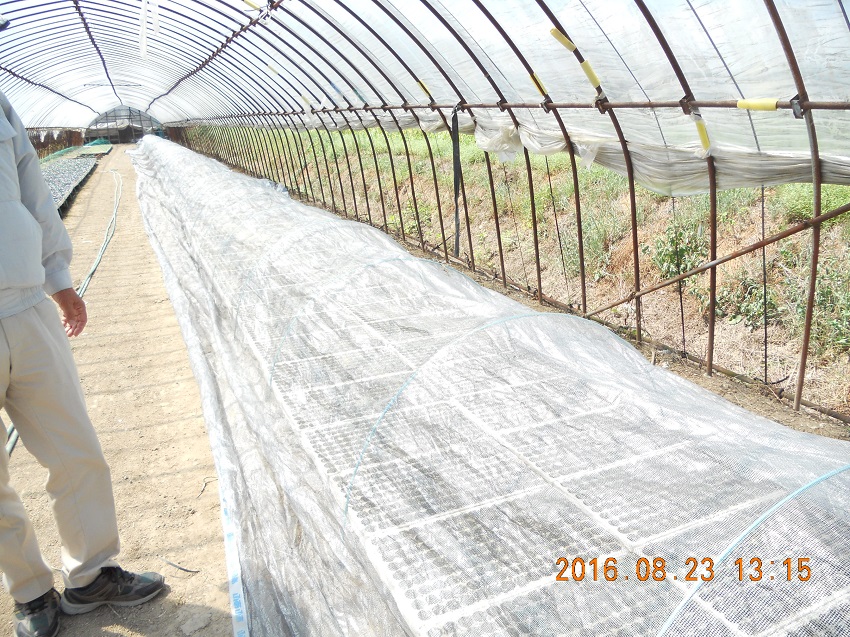 ・上段、中上段:定植直後。やや干ばつ傾向のため、毎日チューブで灌水している。11月出荷予定。