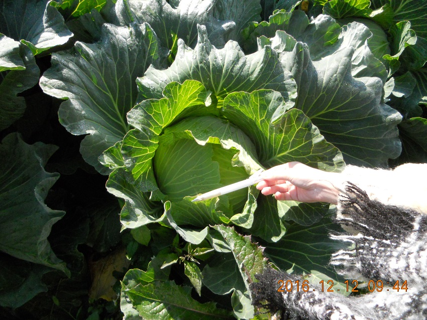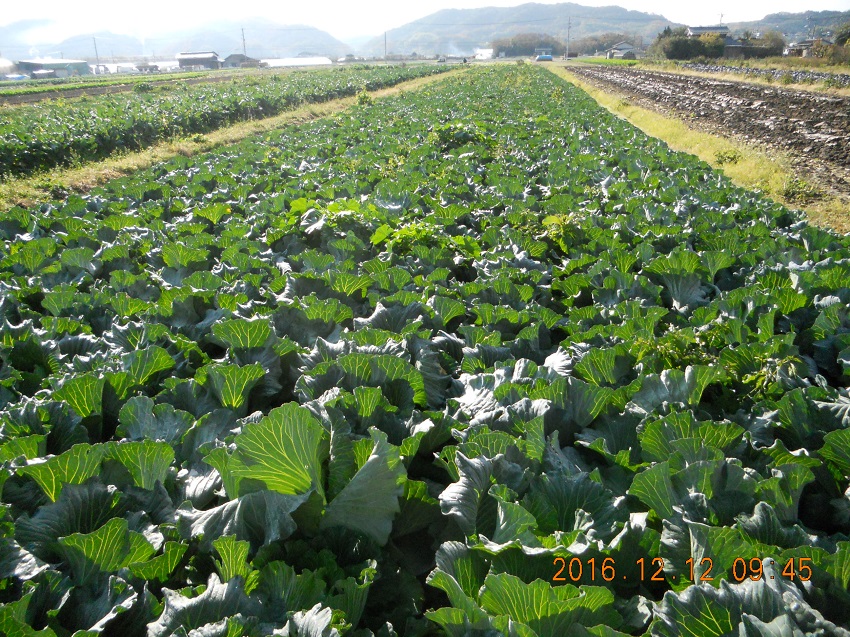 病害虫の発生もない。 出荷間際。 ・中上段:同上。 玉太りも良い。 ・中下段:9月20日ごろ定植の圃場全景。 病害虫の発生もなく、順調に生育中。 2月〜3月の出荷予想。 ・下段:同上。 結球中期。 | ||||||