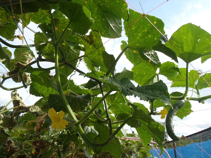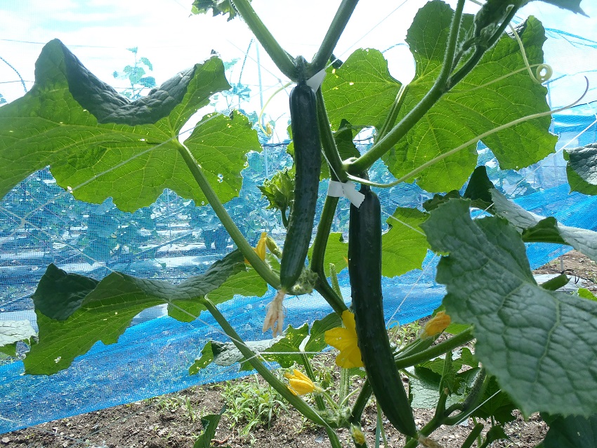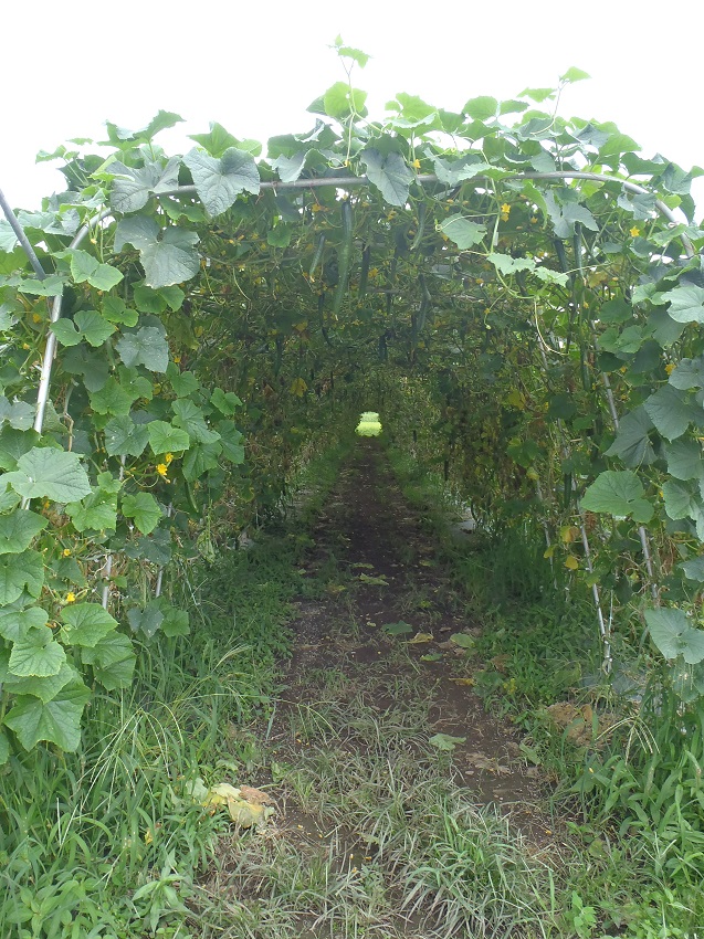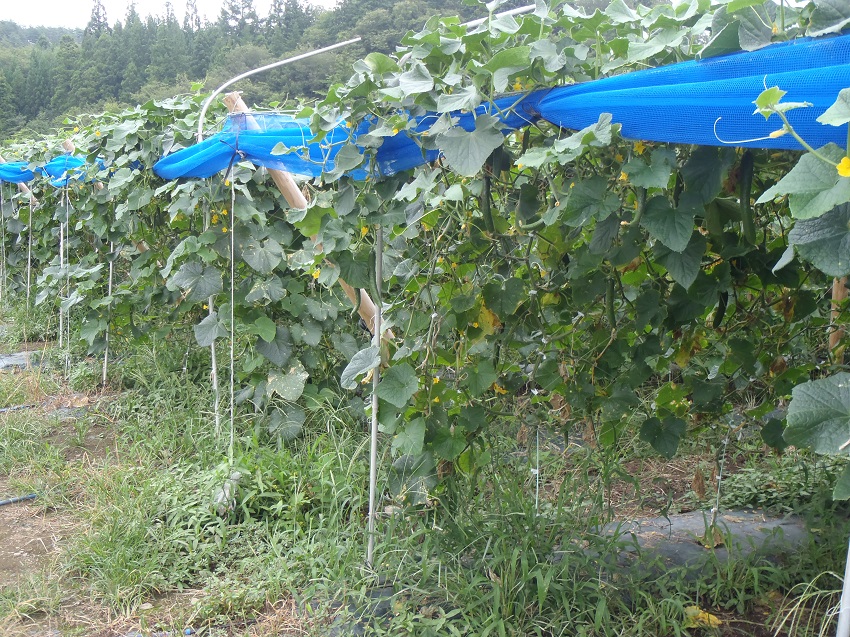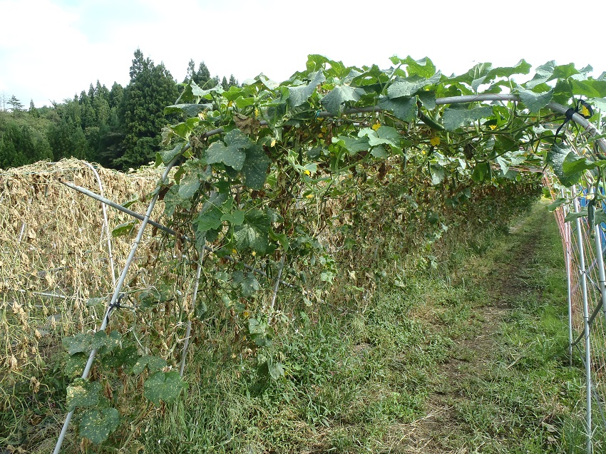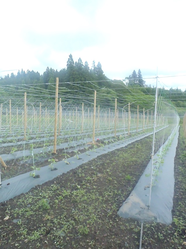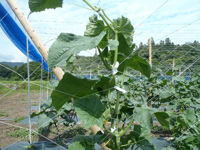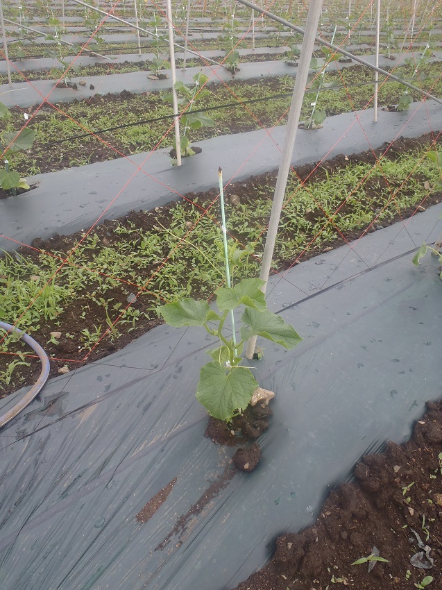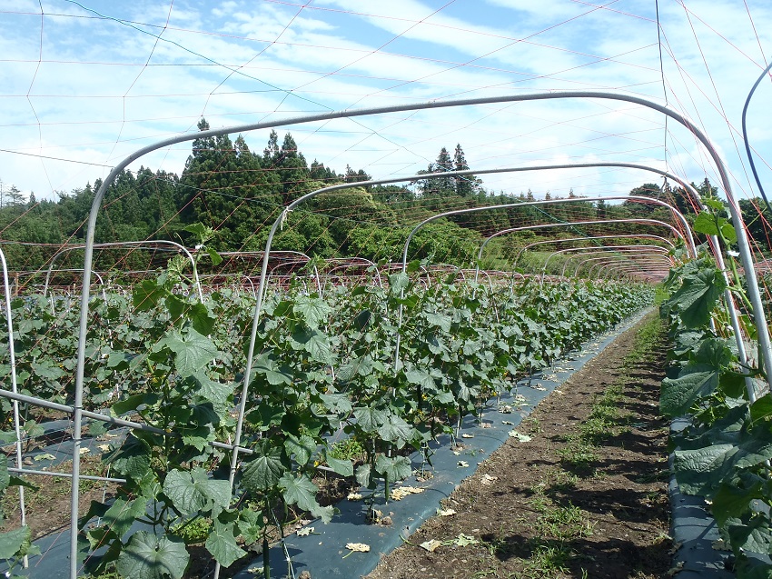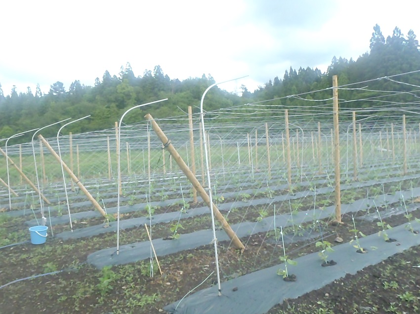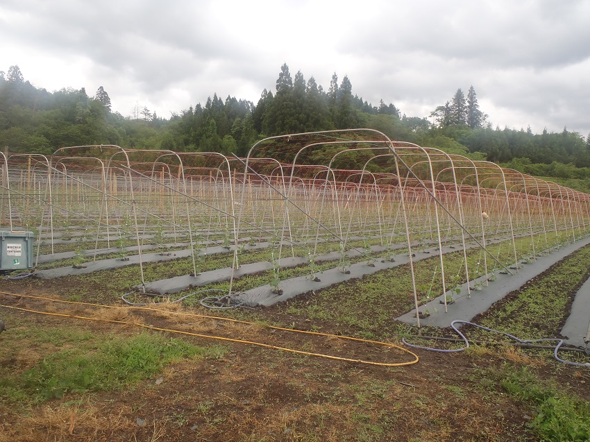 ・今回調査した圃場では従来のアーチ型の支柱に加えて、棚仕立てに取り組むとのこと。 また、出荷規格・形態も今年度出荷分から見直ししており、生育、出荷両面で地域をあげて生産性向上に取り組んでいる。 ・5月20日頃に定植。 ・中下段:棚仕立て。 | ||||||