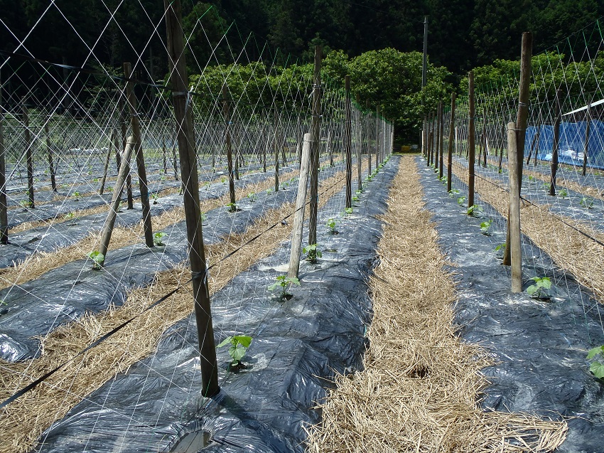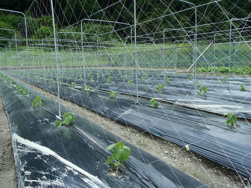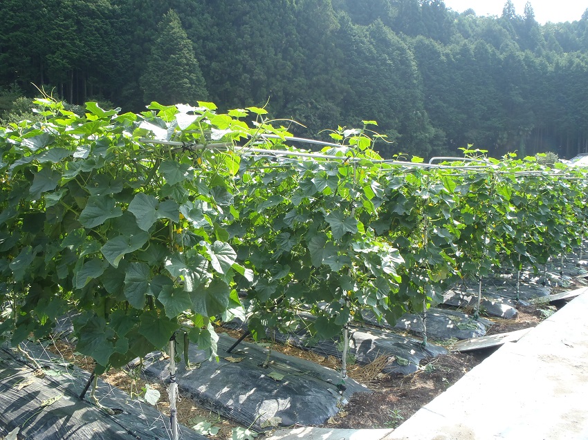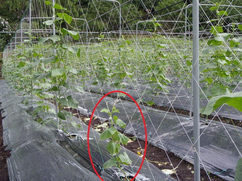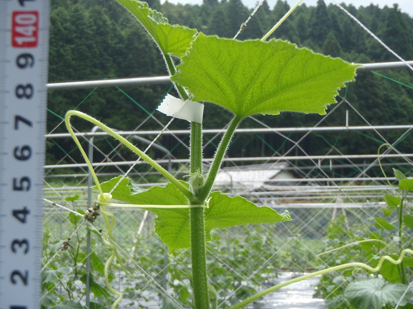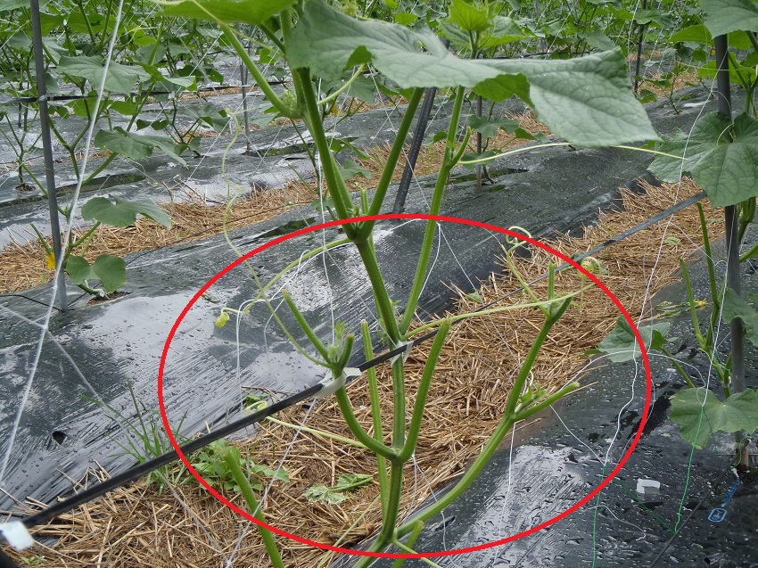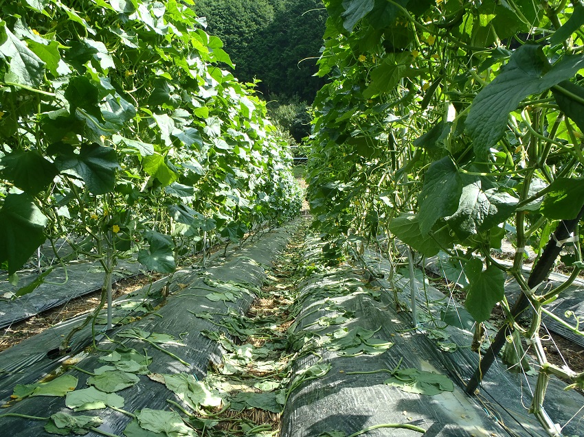 ・定植日:6月21日。 ・圃場は山間地にあり、夏の冷涼な気候を利用した夏秋採りを行っている。 ・黒マルチが用いられており、畝と畝の間には藁が敷かれていたり、堆肥が投入されている。 ・調査産地は山間地にあり、近年、鹿・猪・アライグマ等による被害が多くなってきている。 中下段:きゅうりの圃場においても鹿に葉を食べられる被害が出始めている。 葉を食べられた株の今後の生育が心配される。 ・下段:定植直後に、強風により根を回され生育が遅れている株。茎が細く根が張っていない。 ・現在、病害虫の発生はなし。 | ||||||