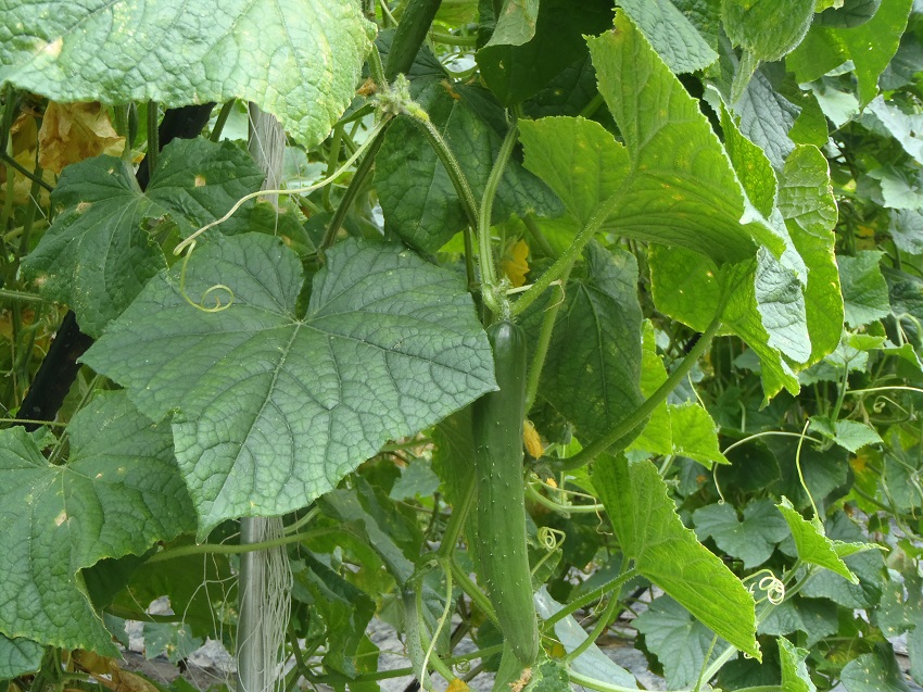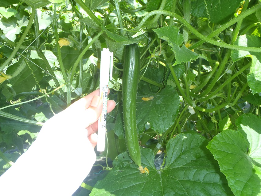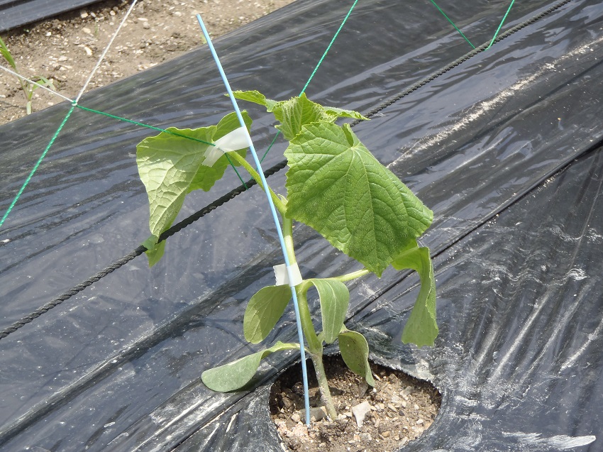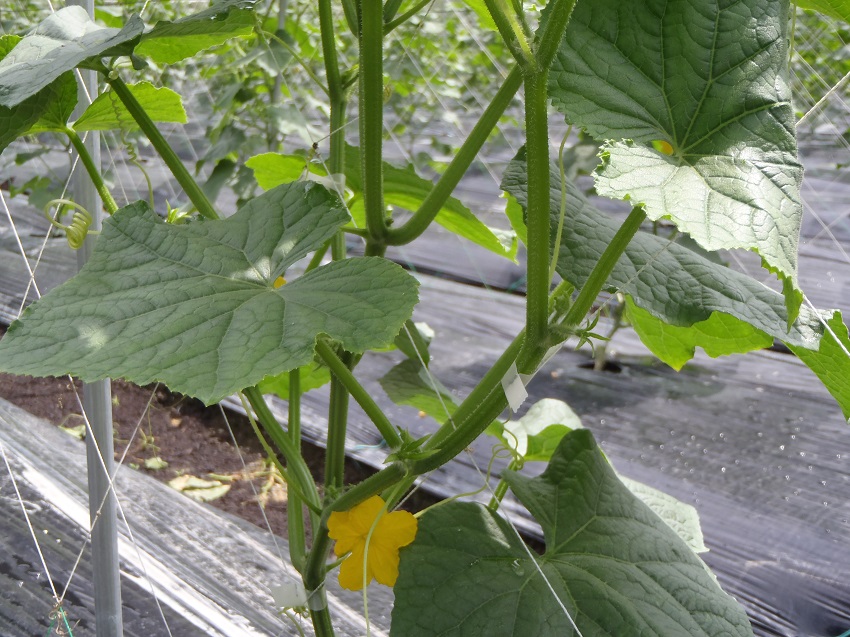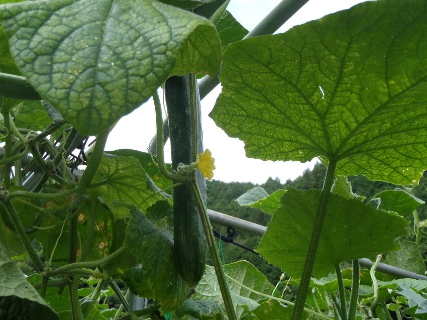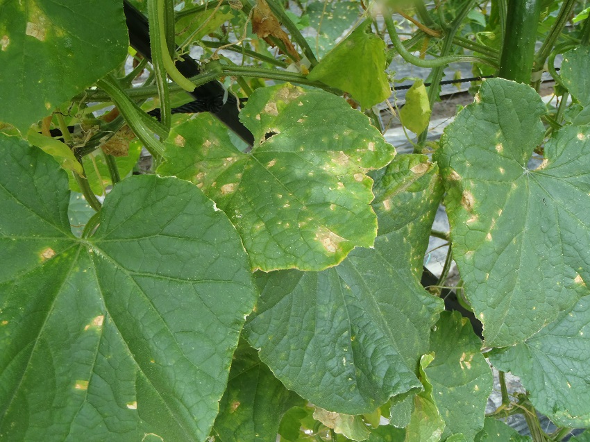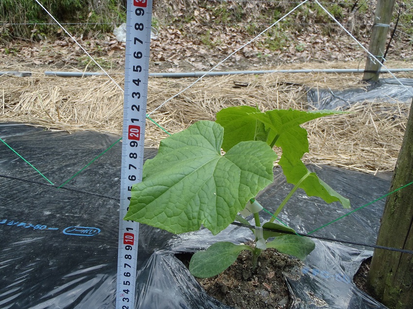 ・定植日:6月21日。 ・圃場は山間地にあり、夏の冷涼な気候を利用した夏秋採りを行っている。 ・黒マルチが用いられており、畝と畝の間には藁が敷かれていたり、堆肥が投入されている。 ・調査産地は山間地にあり、近年、鹿・猪・アライグマ等による被害が多くなってきている。 中下段:きゅうりの圃場においても鹿に葉を食べられる被害が出始めている。 葉を食べられた株の今後の生育が心配される。 ・下段:定植直後に、強風により根を回され生育が遅れている株。茎が細く根が張っていない。 ・現在、病害虫の発生はなし。 | ||||||