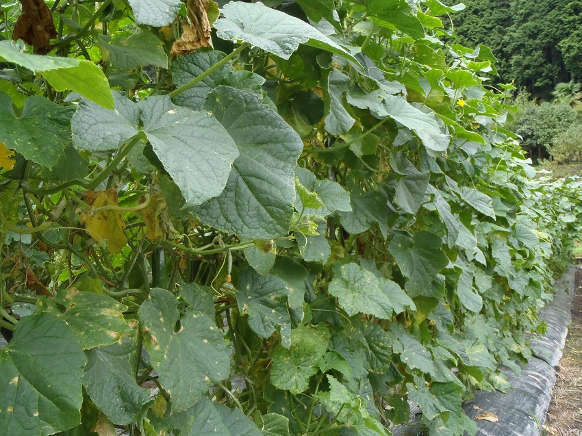 ・定植日:6月21日。 ・終盤期となり、褐斑病やベト病が全体に広がっている。 ・収穫量は、最盛期の1/4程度まで減少しており、後10日ほどで終了となる見込み。 | ||||||