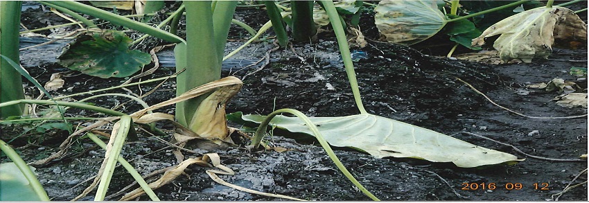 ・作型:全期マルチ。 ・生育状況:葉焼けが圃場全体に見受けられる。 | ||||||