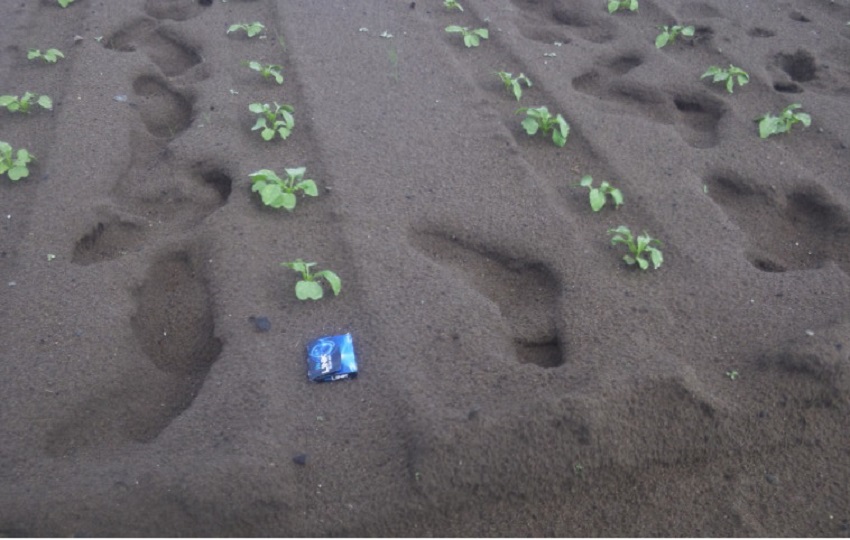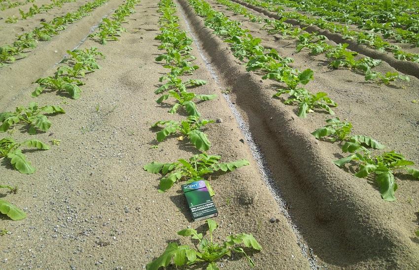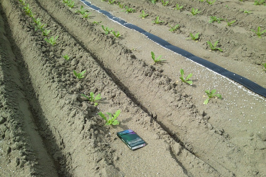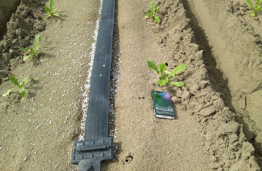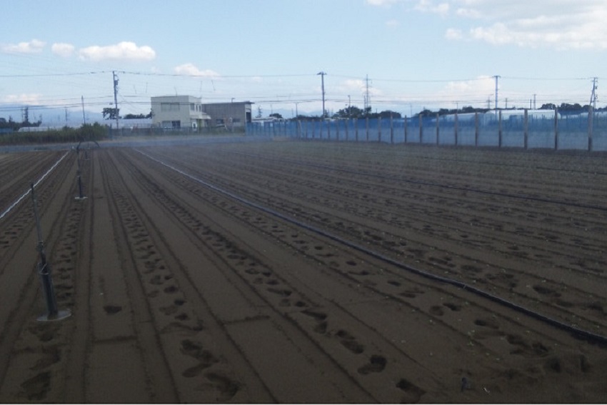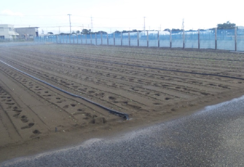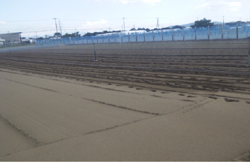 (溝切されているのが確認できる) ・中上段:圃場近景。 (灌水チューブが設置されている) 通水時に、より肥料が行き渡るよう、チューブの周りに元肥が多い。 ・中下段:9月に播種した圃場近景。 ・下段:同じ圃場の全景。 (こちらの圃場は溝切されていない) | ||||||