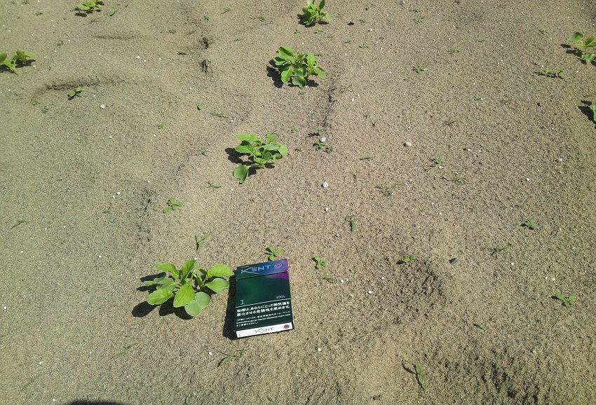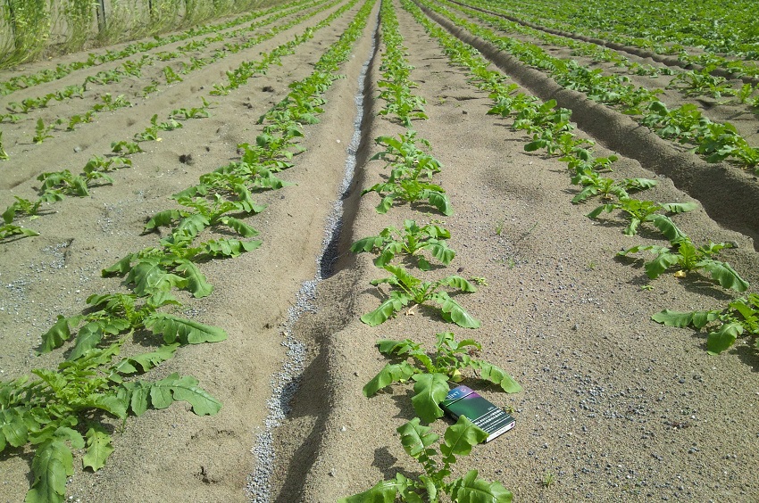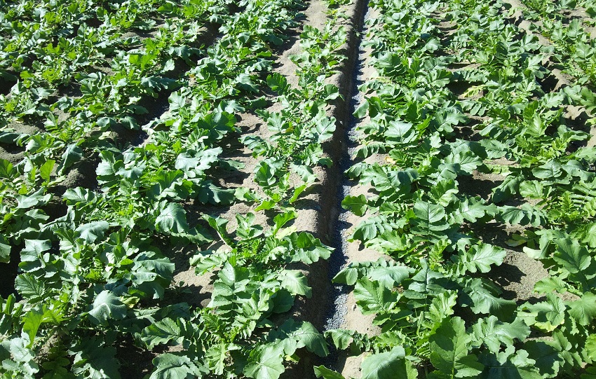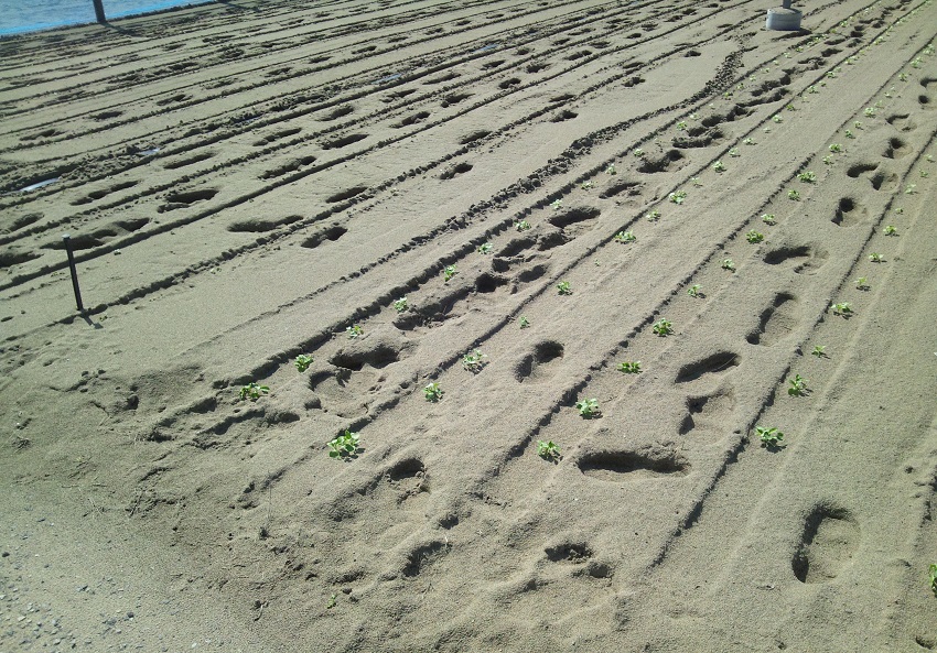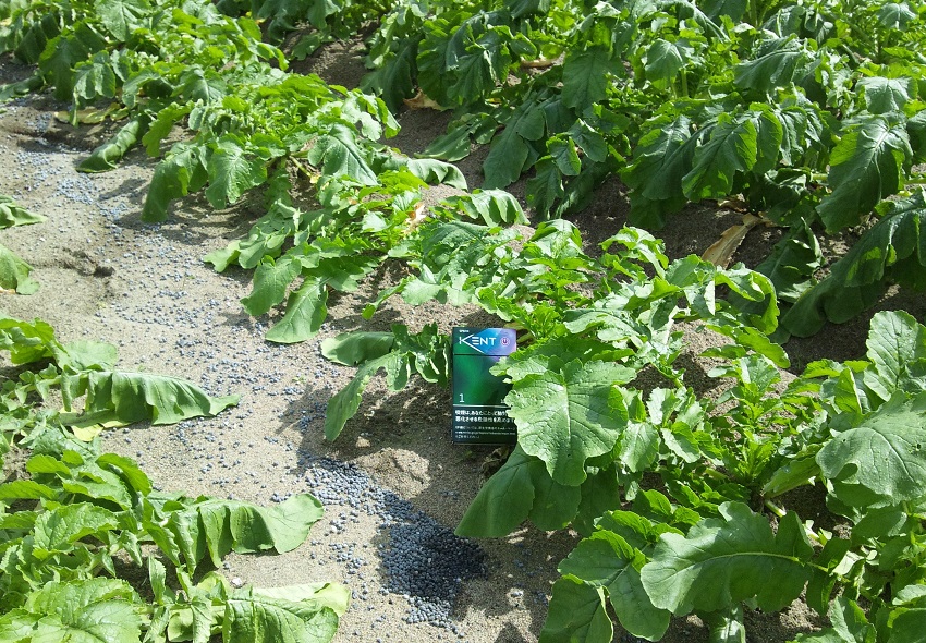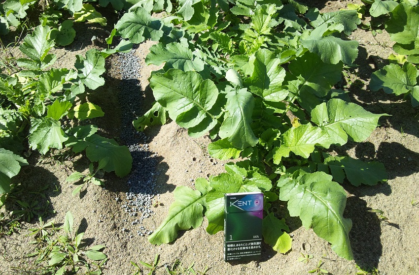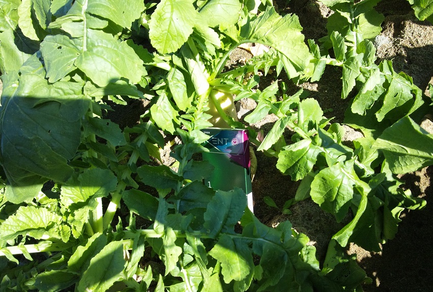 (9月上旬に播種) 追肥が施されている。 ・下2枚:8月下旬に播種した圃場。 こちらも追肥を施してある。 果実が3cm程度見えてきている。 | ||||||