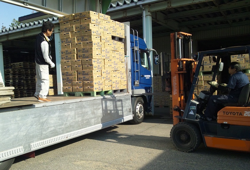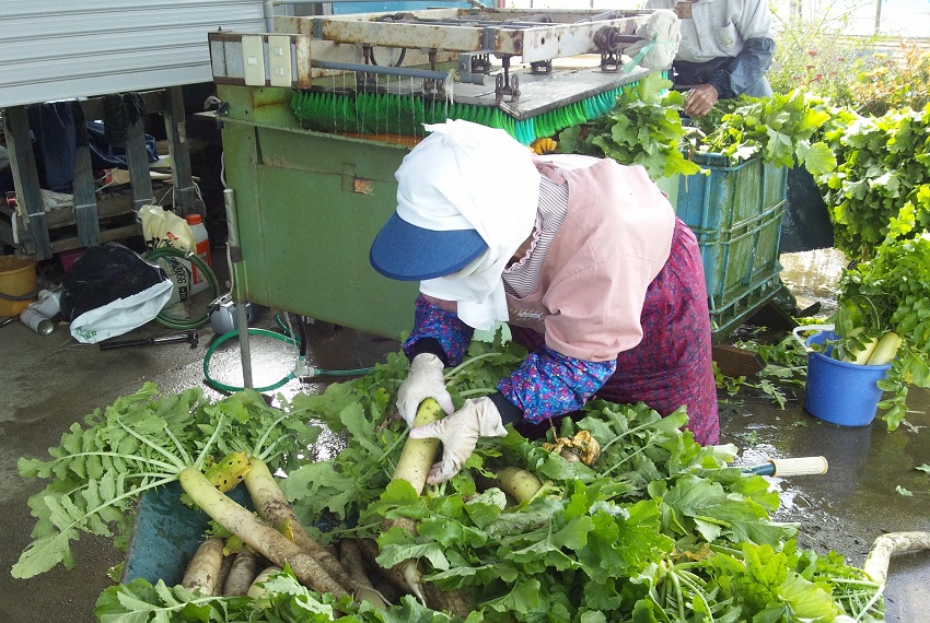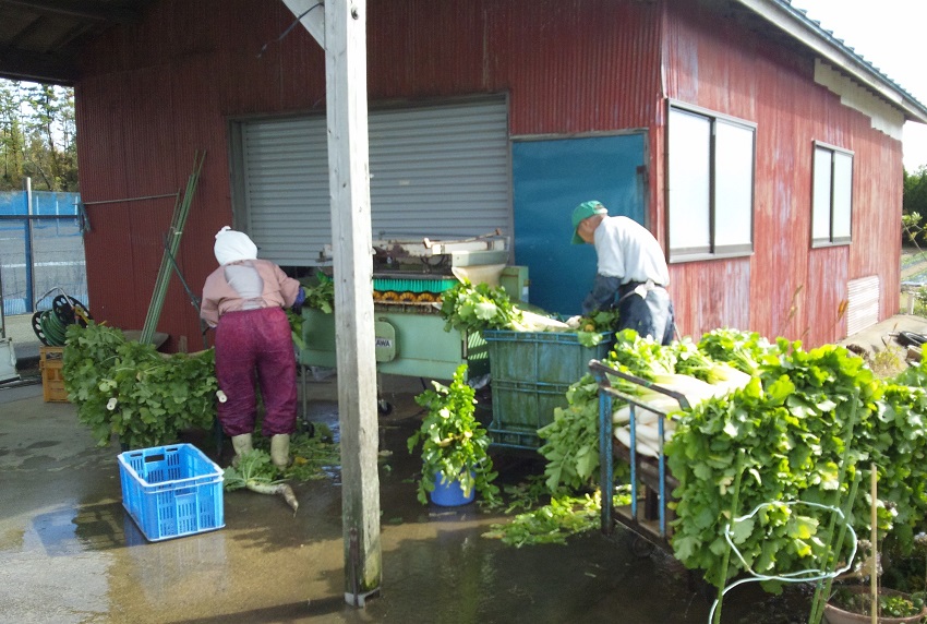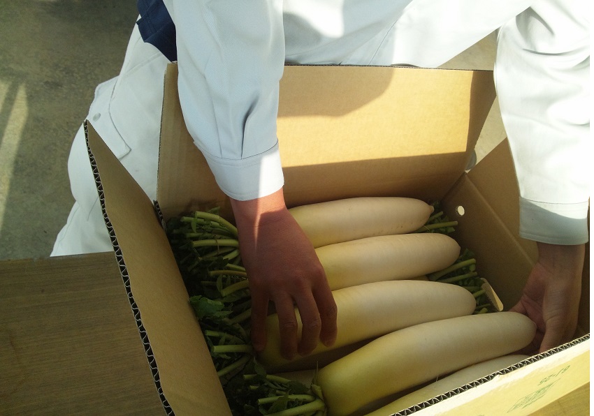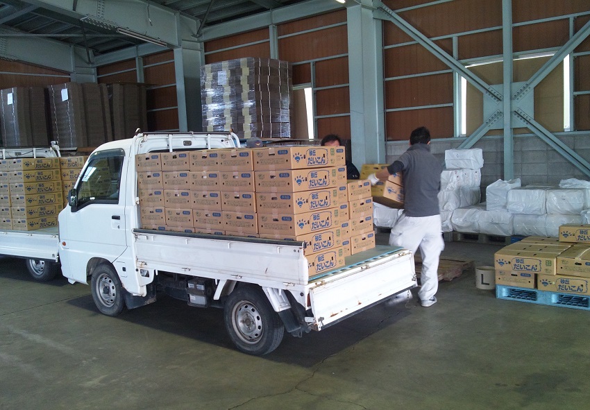 ・中段:検査が通っただいこんをサイズ毎に区分けしている。 ・下段:区分けされただいこんを市場行のトラックに積んでいる様子。 (今回は、近畿市場へ配送とのこと) | ||||||