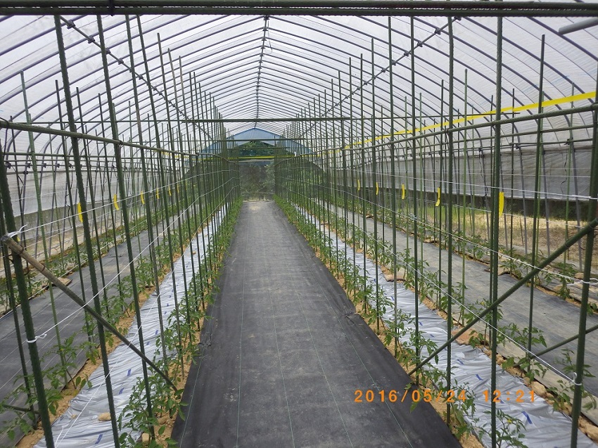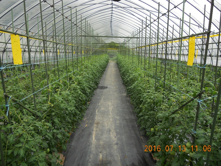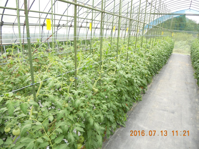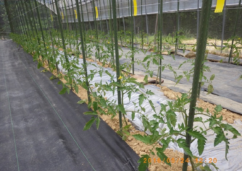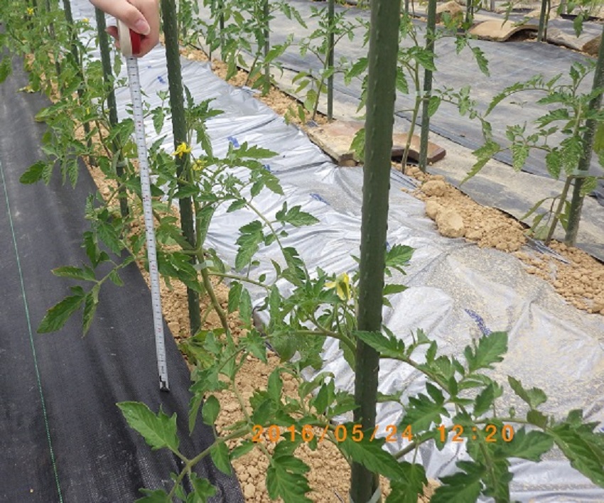 ・中上段:第一花房が咲き始めている。生育は平年並み。 ・中下段:茎頂は40cmほどである。 ・下段:少し遅れて5月14日に定植を行った。順調に生育中。 | ||||||