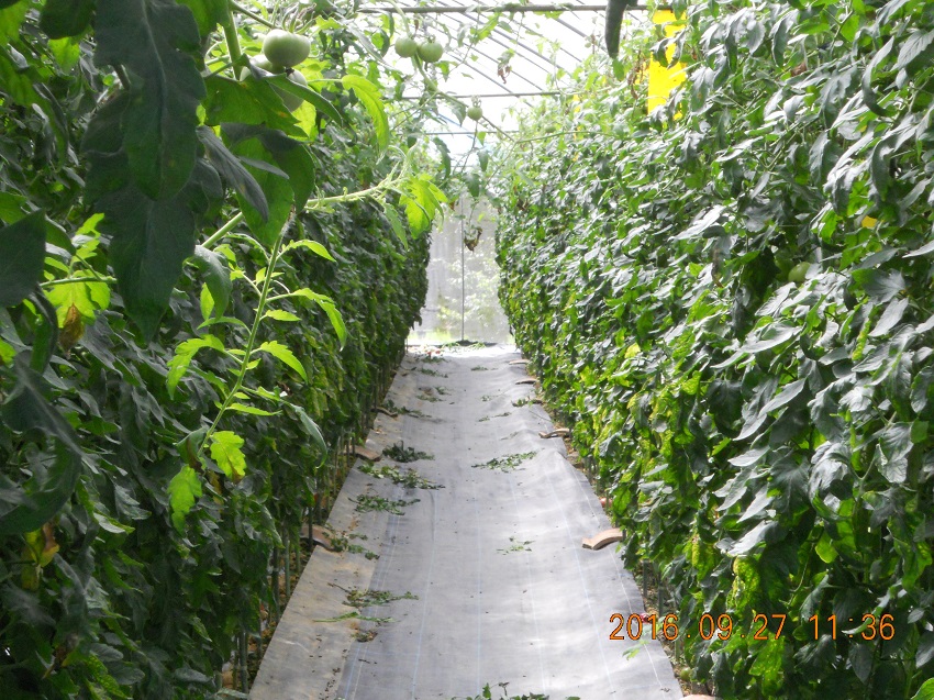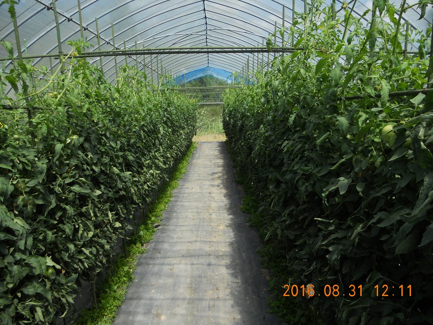 ・上段:全景。若干管理が遅れている。灰色カビ病の発生も見受けられる。