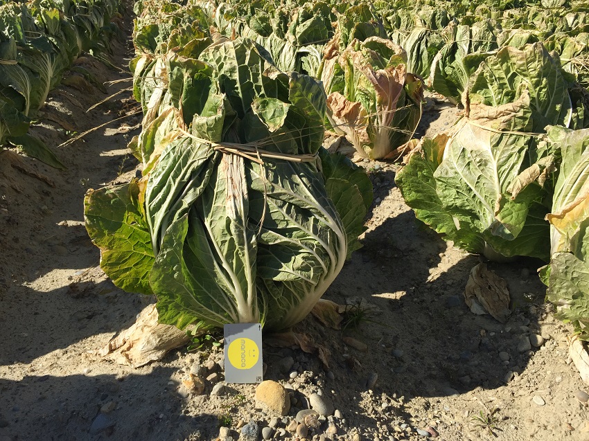 出荷の際は、外葉を数枚取り、箱5玉で出荷している。 病害虫の影響もなく、良品質の物が出荷されている。 品種は、黄さらぎ(黄芯系でおいしいので、生食には向いており、次期も作付予定)。 ・中下段、下段:出荷待ちの圃場。 周りの圃場は収穫が終わっている。 | ||||||