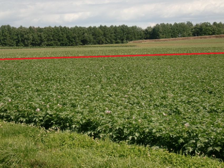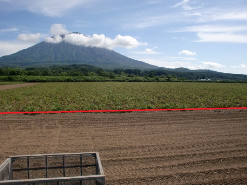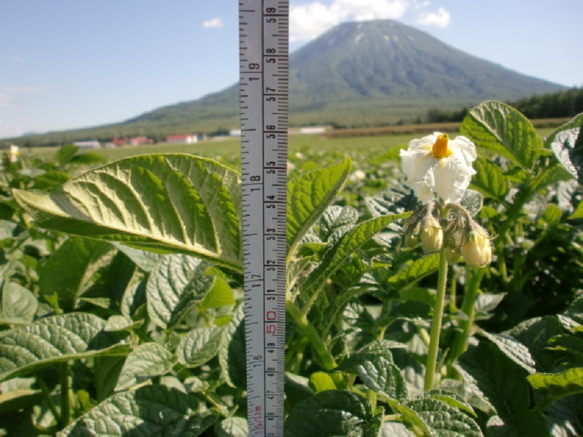 ・写真の圃場は、倶知安地区でも水はけ等比較的条件が良い地帯。 ・上段:4月上旬から5月上旬に植え付けた圃場で赤線より下が男しゃく、上がとうや。 男しゃくは花が咲き始め。 ・中上段:男しゃくで欠株なし、病害の発生も見当たりません。培土もしっかり。 ・中下段:上2枚と同じ圃場ですが、品種は「とうや(白い花)」です。草丈60cm。 ・下段:中上段と同じ圃場でとうやで、病害虫の発生なし。 | ||||||