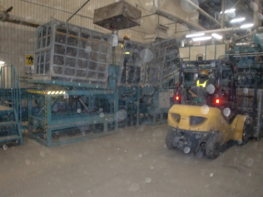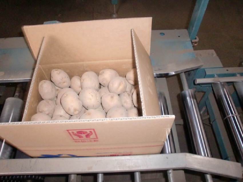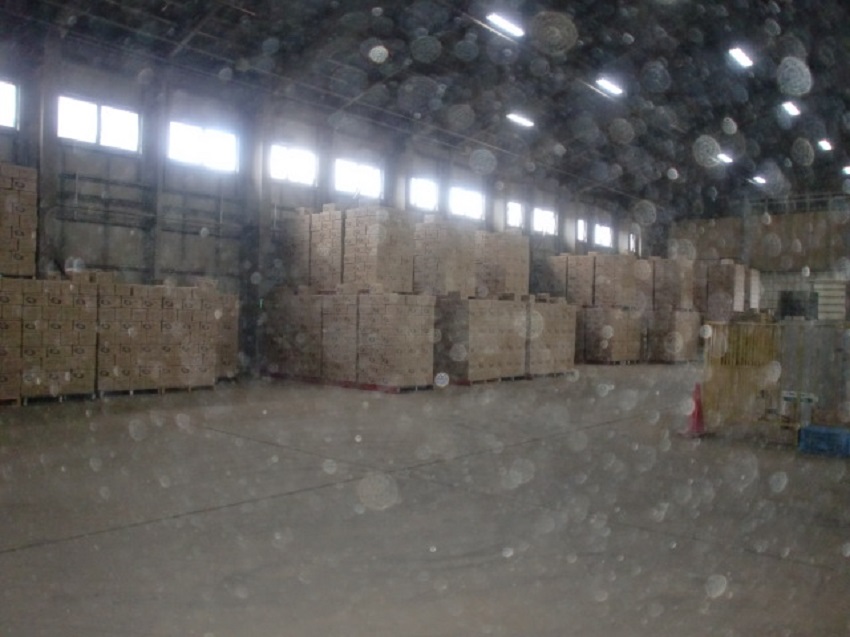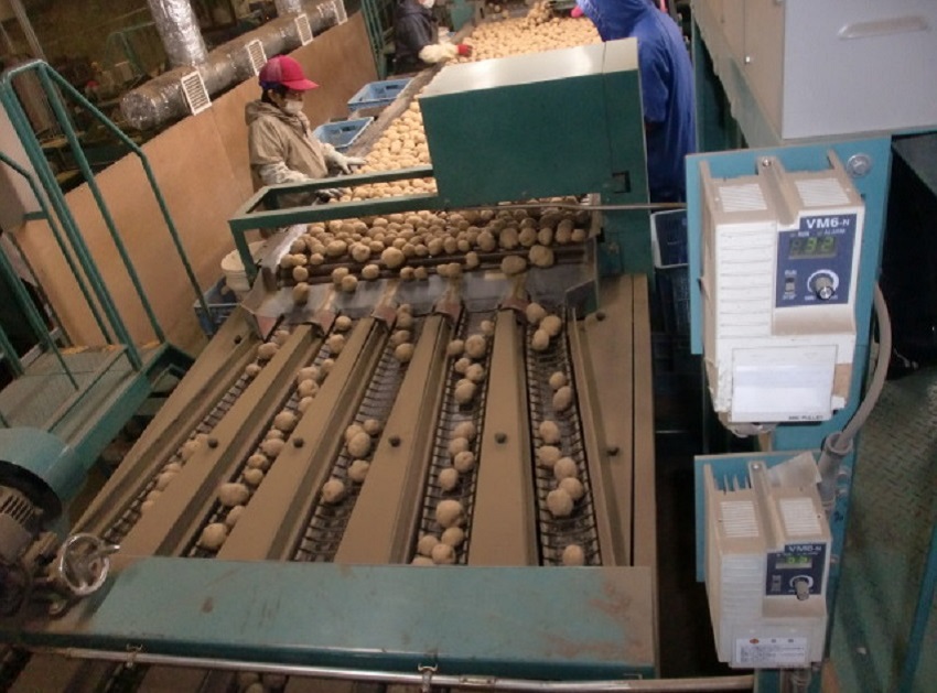 ・上段:選果するため、大コンに入った馬齢しょを傾けて、選果ラインに投入しているところ。 ・中上段:幾つかの選果ラインを通過して、腐れ等の不良品を除いているところ(目視による選別は同ラインで複数している)。 ・中下段:規格別に10kgダンボールに詰められた状態で、この後、上蓋が閉じられる。 ・下段:規格別にパレットの上に置かれた状態で、出荷を待っている。 | ||||||