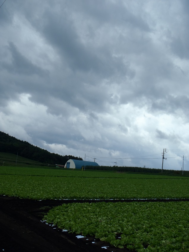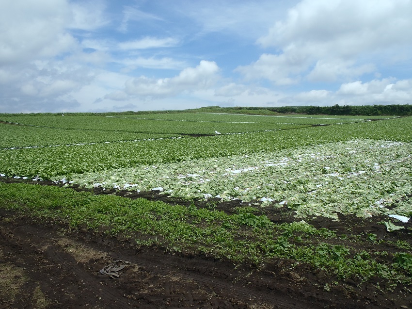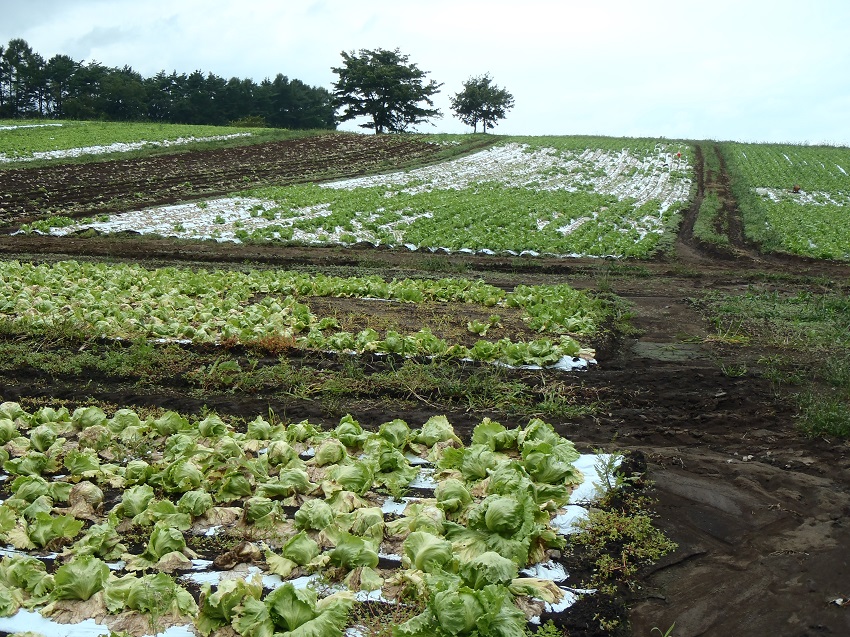 その前週8/26には台風10号を上回る大雨(80mm程度)が降っており、降雨の連続に水はけの悪い圃場では土が乾く間ががない。 ・雨の合間をぬって、10月半ばの終了期に向けて、最後の定植を行ったので、今後は天候の変化等に合わせて適切に圃場の管理をしながら出荷量を確保していく。 ・上段:台風・大雨が続いている。現地調査の日も曇天。 ・中上段:雨でイタミがひどい圃場。出荷出来るものを選別して出荷。 ・下段:側溝があったが、流されてきた土で埋まっている。圃場内も大雨の影響は大きい。 | ||||||