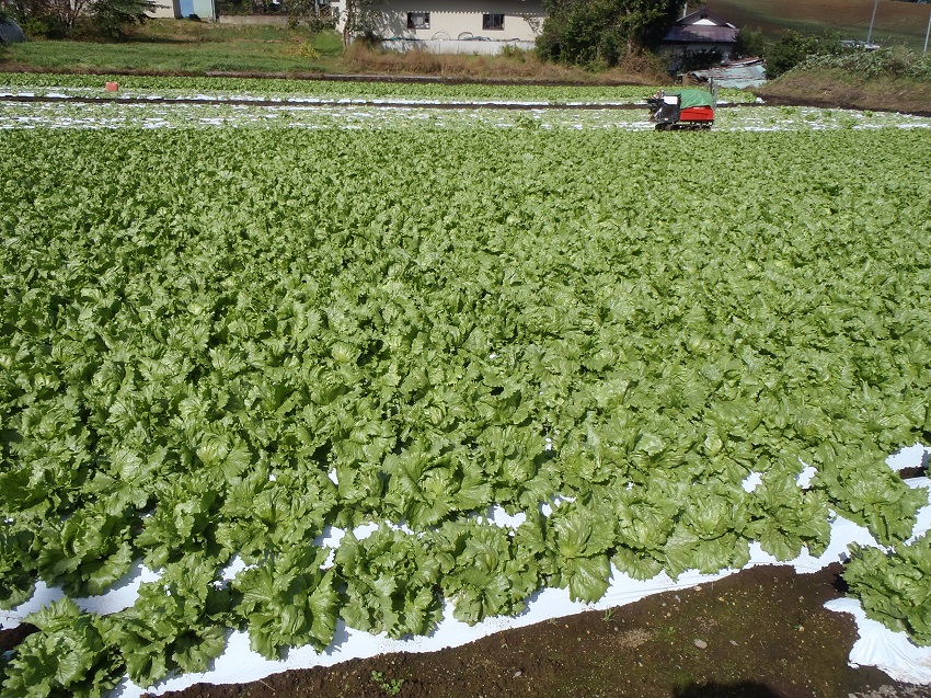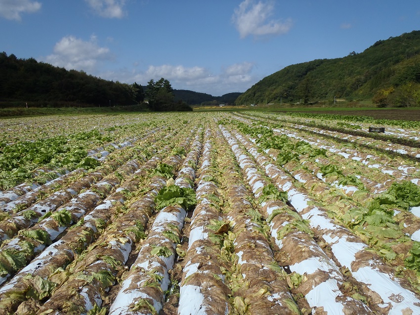 ただし、10月初め頃には例年だと、霜が降りる程度の気温となるはずが、今年はそこまで下がらないため、出荷できる状態が続いており、終盤期の現在でも出荷量を確保している。 ・上段:多くの圃場で最後の収穫。 ・中下段:8月下旬に定植した圃場。間もなく出荷。 | ||||||