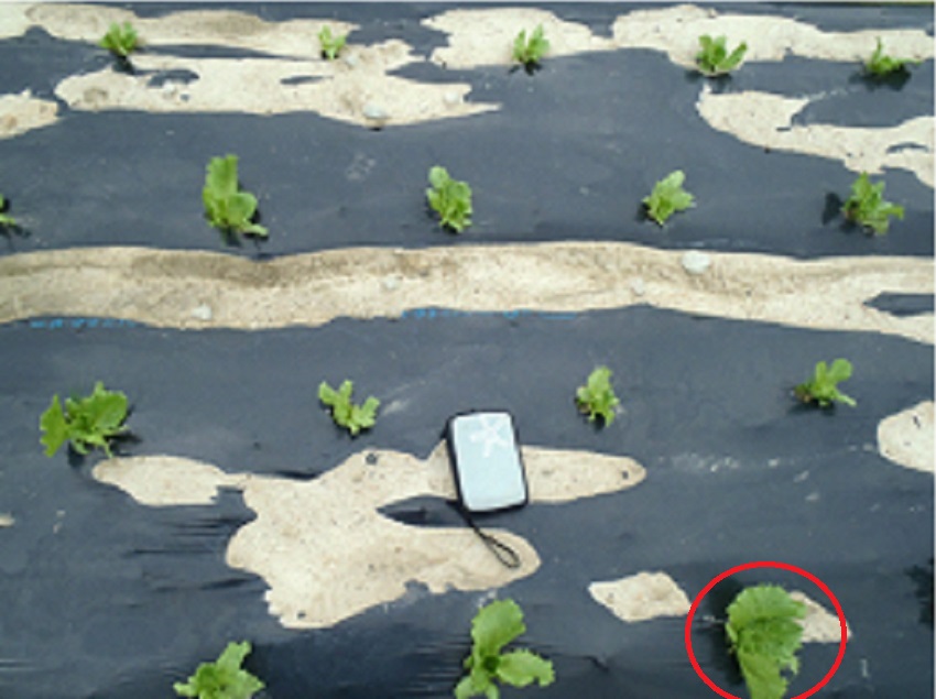 気温が高かったため、出荷が前進化している。 ・中上段:11月中旬定植、1月下旬収穫予定の圃場。 本来ならば、2月頭に出荷予定だった。10日程早まっている。 ・中下段:11月中旬定植、1月中旬収穫予定。 一部、鳥による食害を受けた圃場。生育にばらつきが見られる。 ・下段:11月中旬定植、1月中旬収穫予定。 右上の株が正常の生育。それより小さな株は食害を受けたもの。天候次第では結球しない可能性もあり、2月に出荷できるかは不透明。 | ||||||