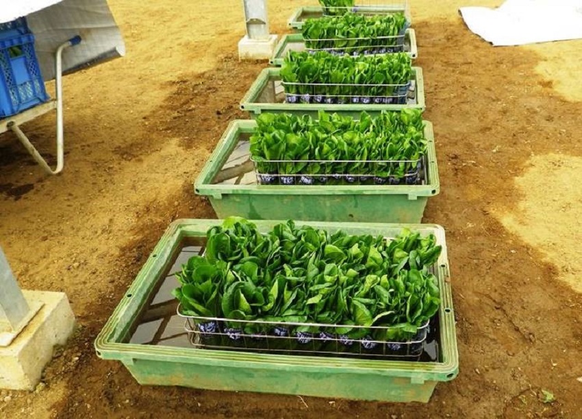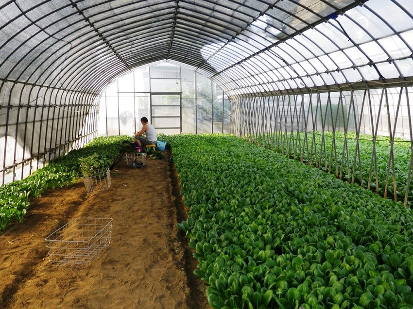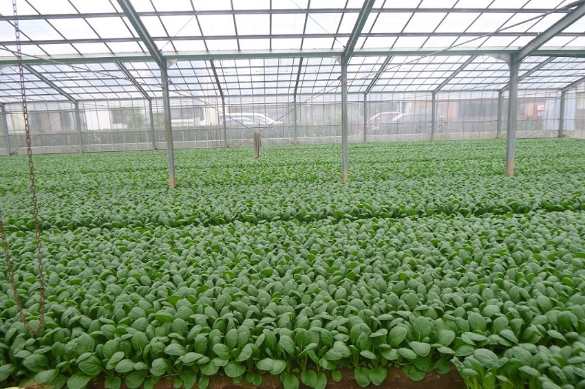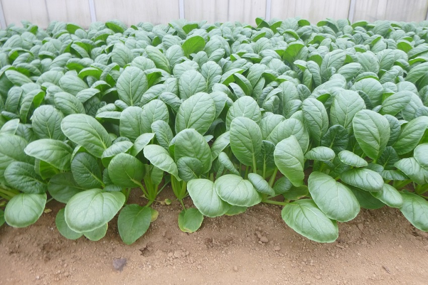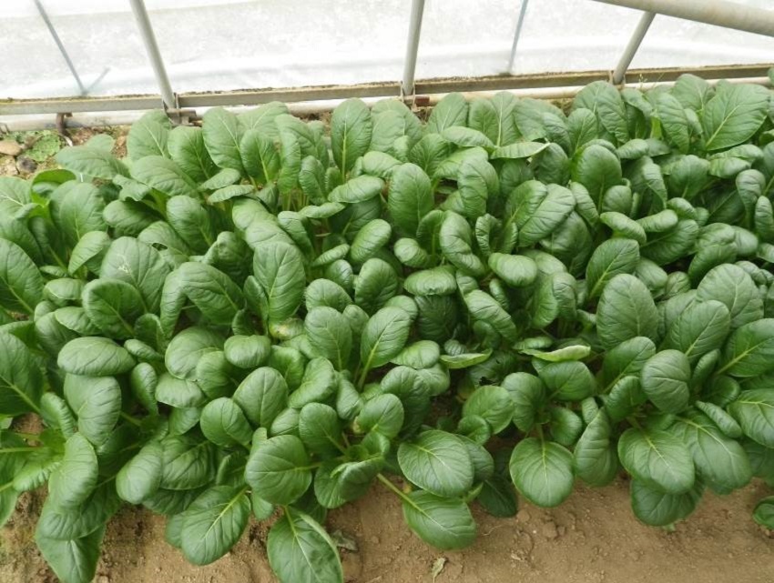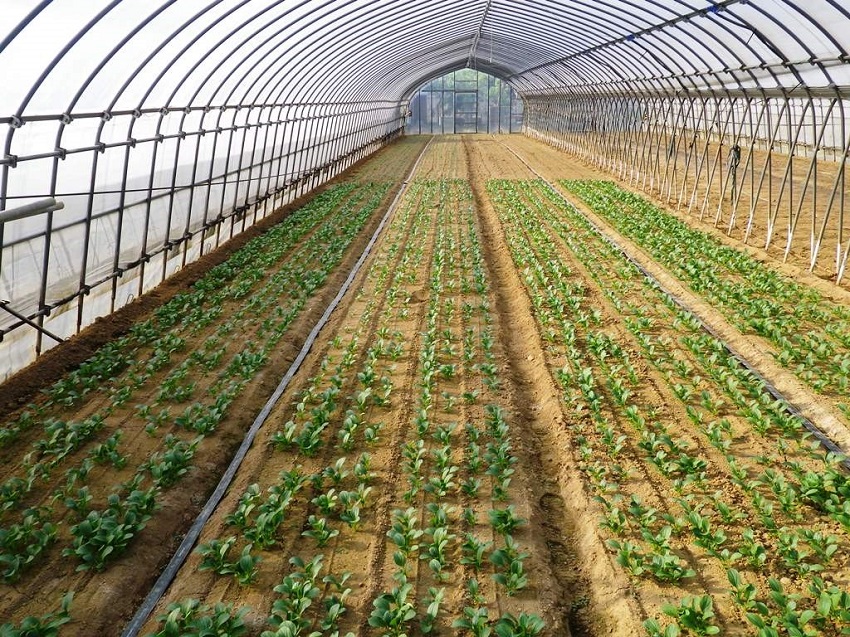 ・上段:4月上中旬に播種されたコマツナ圃場である。ハウス内を4分割し、播種面積を細かく調整し生育速度と収穫のバランスをとっている。