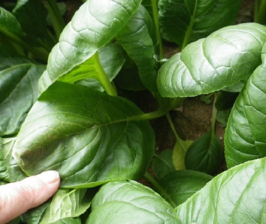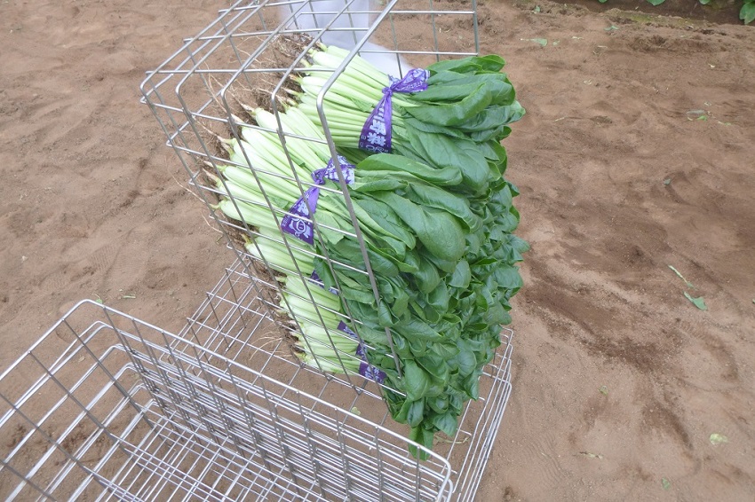 高温乾燥の影響が見られるが、生育揃い、品質は良好である。 出荷先は主に築地市場であり一束500gで収穫・結束が行われる。 業務用出荷を兼ねており、クレーム対応のため病害虫管理が行き届いている。 ・下段:業務向け出荷の規格で収穫・結束されたこまつなである(一束1kg)。市場出荷よりも大きめのサイズで収穫されている。 | ||||||