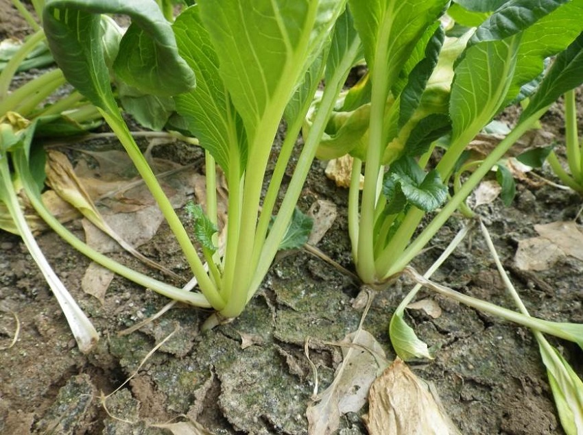 ・上段:9月中旬に播種されたこまつな圃場である。高温の影響が見られ、かつ、日照不足の影響により例年より軟弱徒長気味である。
