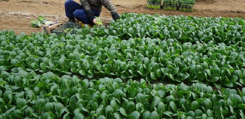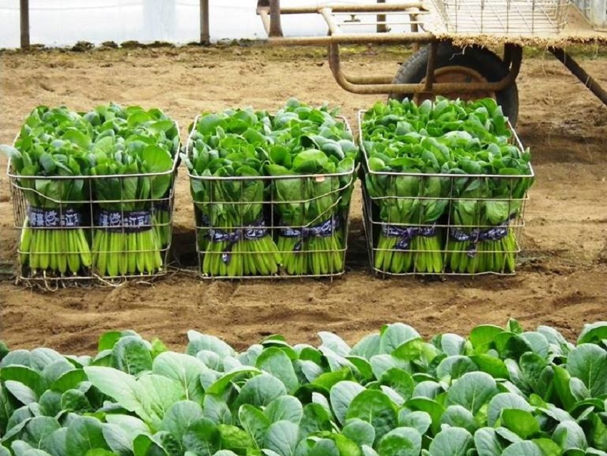・上段、中上段:年末向けこまつなの収穫作業である。出荷先は築地市場(促成)であり、品質は極めて高い。品種は「いなむら」を使用。