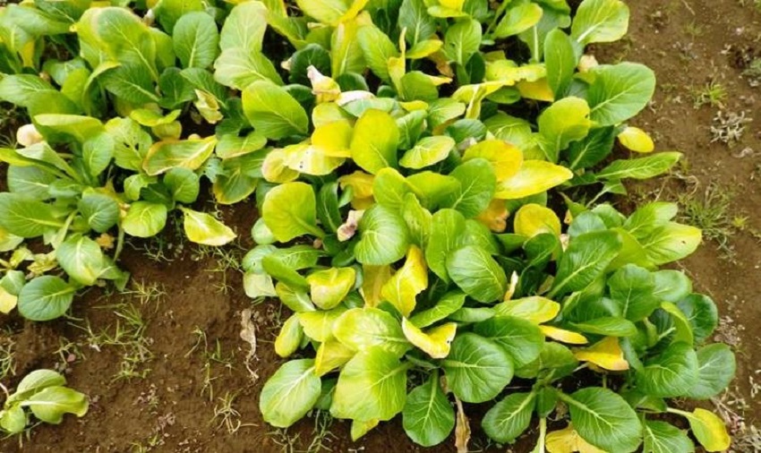 ・中下段:年末向けこまつなの収穫作業である。 出荷先はこちらも築地市場(促成)である。 収穫後すぐに吸水させ、品質保持を図るとともに、根部の泥を落としやすくしているという工夫がみられる。品種は「優翠」を使用。 ・下段:露地圃場で発生した黄化症状である。 急激な低温にさらされたのち、下葉が黄化・脱落する症状を呈している。病害と異なり、地際部の腐敗症状は見られない。 11月24日の降雪等の低温ののち、12月中旬ごろから徐々に黄化が発現している。通常1月〜3月にみられる生理障害の一種であるが、12月から発生が見られるのは稀である。 | ||||||