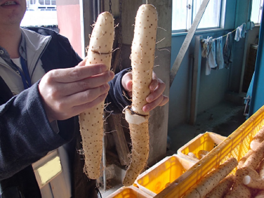 ・時期:出荷最盛期。 ・冠水被害による生育不良が著しい。 ・降雪も早いことから掘り採り作業が滞りがちで、出荷量減に拍車をかけている。 ・細長く先が尖っている傾向。 ・冠水被害時期と思われる生育箇所に、コブ、割れ等多い傾向。 | ||||||