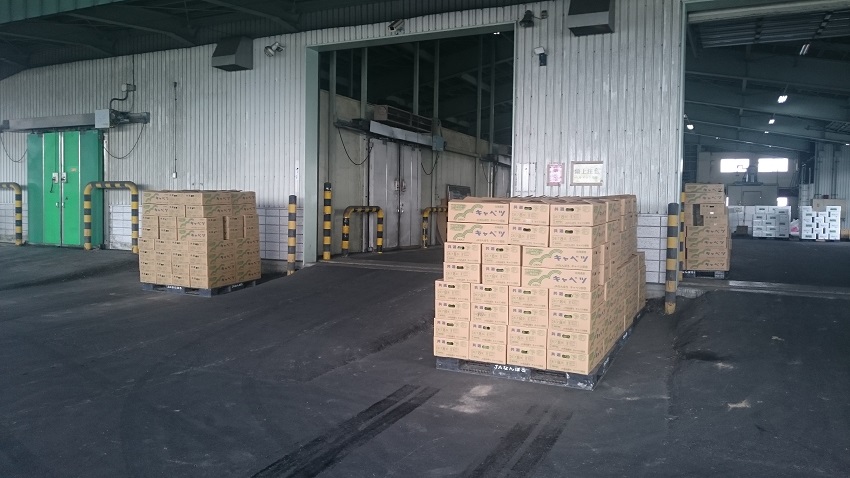 1枚目:集出荷場の様子。 キャベツ以外の野菜も集荷され、必要に応じ保冷庫に入れる。 2枚目:出荷のための積み込み作業の様子。 《下3枚》8月31日撮影。収穫作業の様子とキャベツの近接写真。 | ||||||