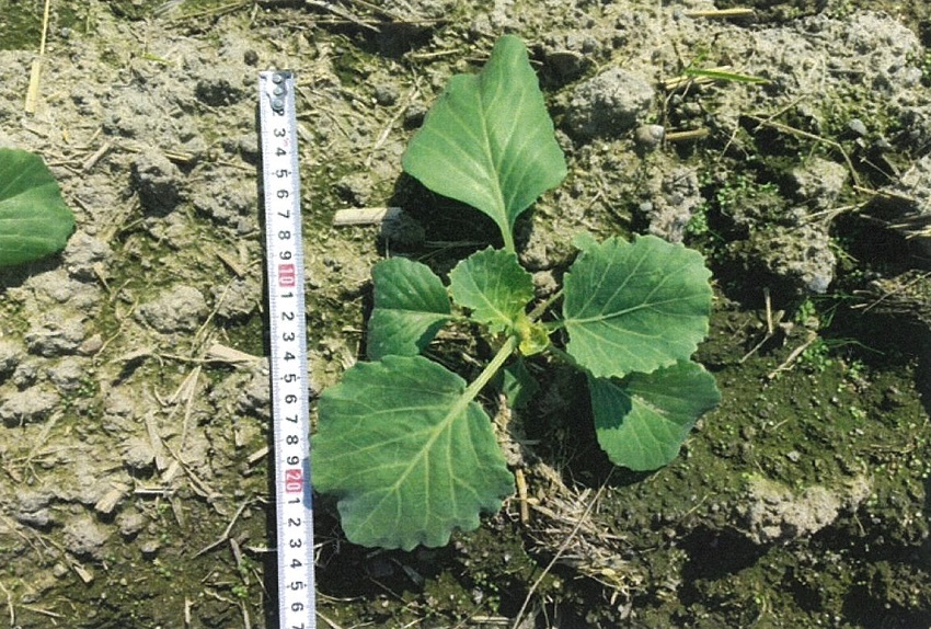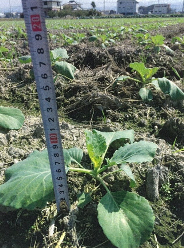 定植後の適度な降雨により、しっかり定着している。 病害虫の発生もなく順調な生育。 4枚目 :9月上旬に定植したほ場では、食害が目立つところもあった。 | ||||||