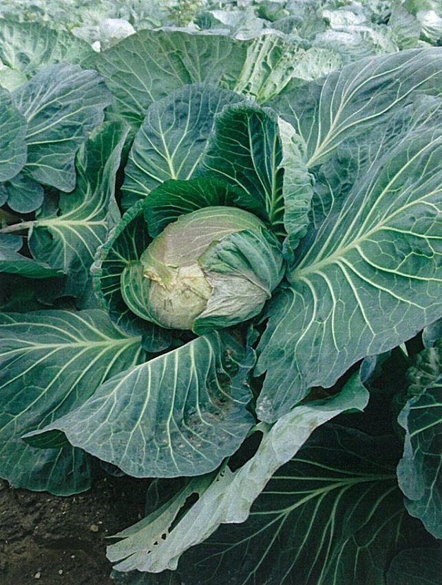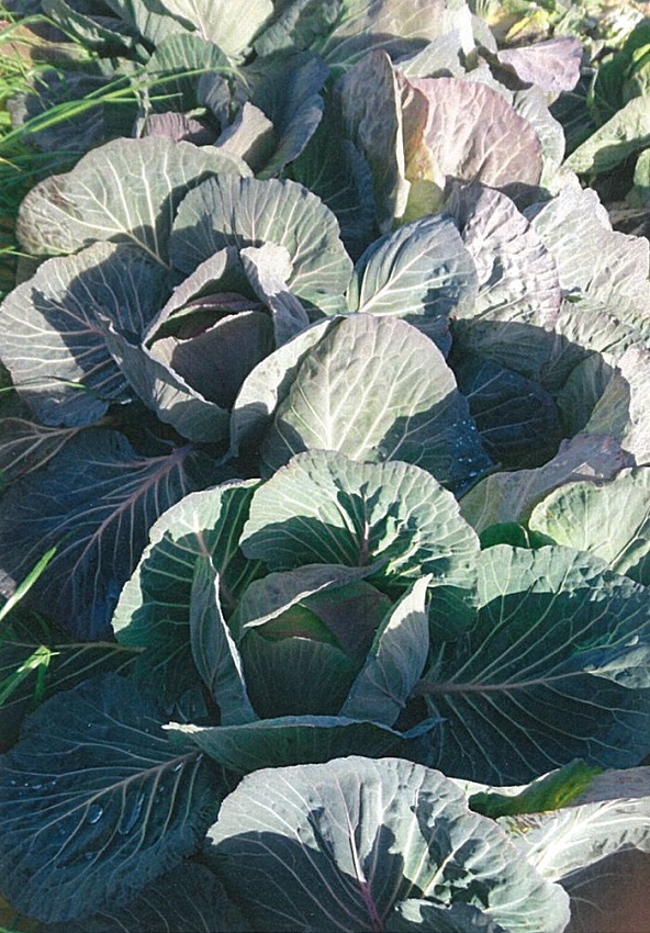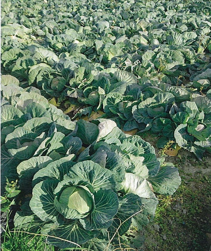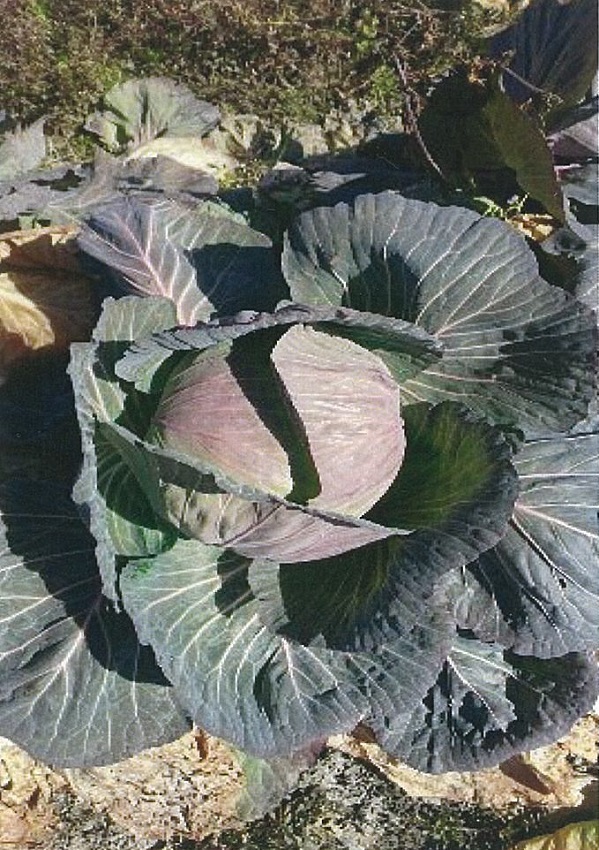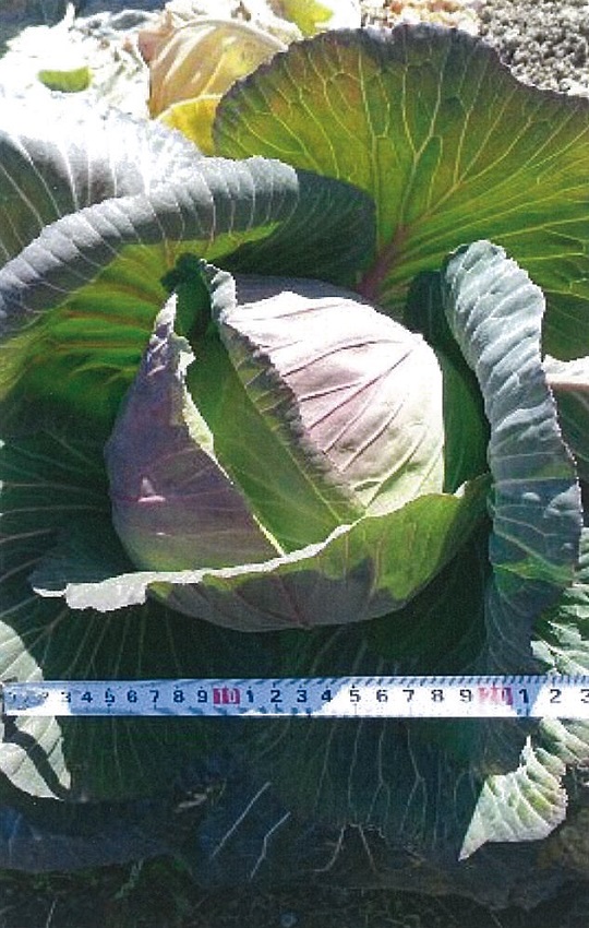 前回調査のひと月前からほとんど成長は止まっている。 2枚目:寒さによる赤みを帯びたキャベツが目立った。 3枚目:低温・多湿により菌核病がほ場全体に広がった。 4枚目:品種 「冬藍」、奨励品種として今年から定植。 病害虫に強く順調に生育している。 | ||||||