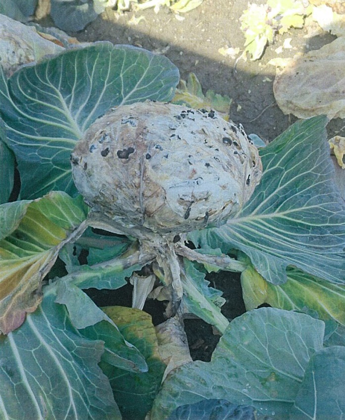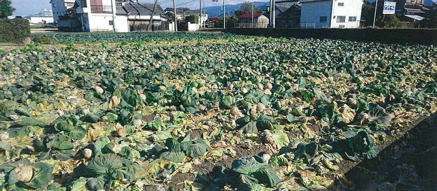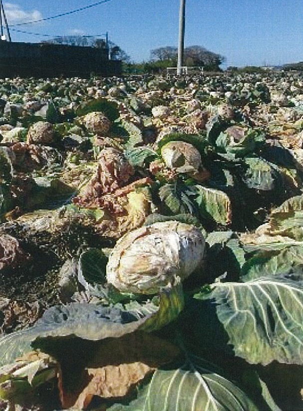 ひと月前から5cm前後の生育にとどまっている。 2枚目:寒さによる赤みを帯びたキャベツ。 同一ほ場において生育にばらつきがみられ、生育はやや不良。 3枚目:低温・多湿により菌核病が発生したキャベツ。 4枚目:ほ場全景。 | ||||||