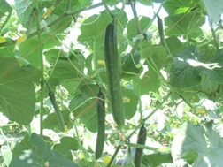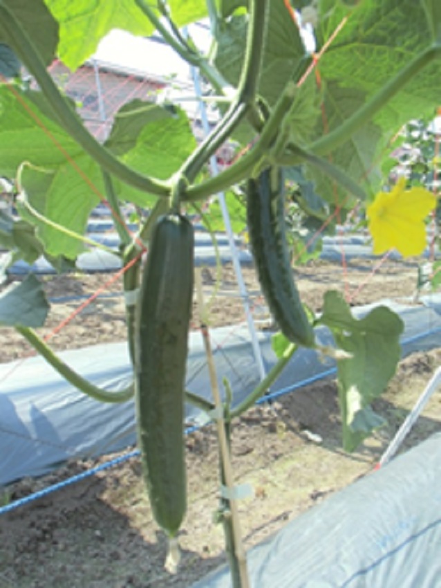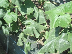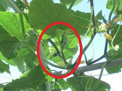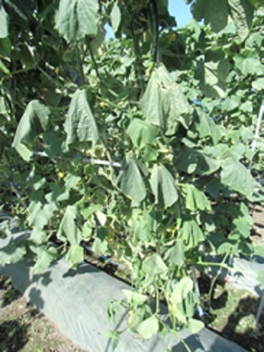 樹は1m60cmの丈を確保しており良好なほ場である。 ・生育停滞のため樹を丈夫にする観点から 10節を目安に実を付けさせるように指導している。(例年は7〜8節) ・黒星病が止まっていない状況から上葉に移っている現状がある。 消毒の徹底が必要である。 ・品種:豊美1号。 ・播種:4月30日 ・定植:6月1日 ・収穫始め:6月27日 ・収穫終り:10月中旬頃 ・上 段:お世話になる園地。 ・中上段:樹丈は160cmを確保。 ・中下段:極太の実が付いている。 ・下 段:黒星病が発生している葉。 | ||||||