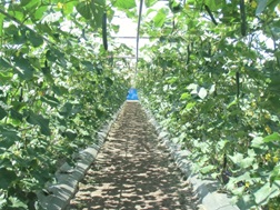 樹は1m60cmの丈を確保しており良好なほ場である。 ・生育停滞のため樹を丈夫にする観点から 10節を目安に実を付けさせるように指導している。(例年は7〜8節) ・黒星病が止まっていない状況から上葉に移っている現状がある。 消毒の徹底が必要である。 ・品種:豊美1号。 ・播種:4月30日 ・定植:6月1日 ・収穫始め:6月27日 ・収穫終り:10月中旬頃 ・上 段:生育が7日遅れの園地。樹体・側枝の伸びが遅い。 ・中上段:葉のしおれが目立つ。 ・中下段:良い果形が多い。 ・下 段:良い側枝が発生している。 | ||||||