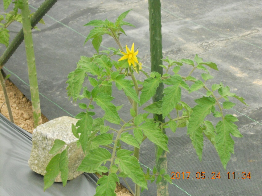 上段、中上段:5月4日に定植を行った。順調に生育している。 中下段:5月5日定植の小苗のほ場。 マルチ、通路のシートをまだ敷いていない。 生育自体は問題ない。 下 段:第一果房の開花状況。 | ||||||