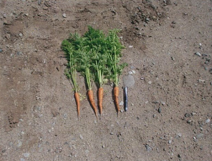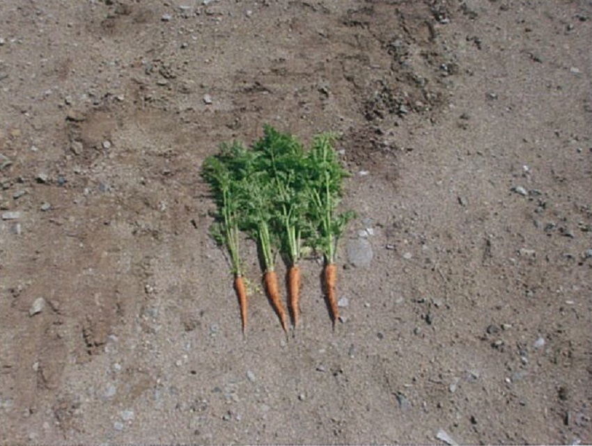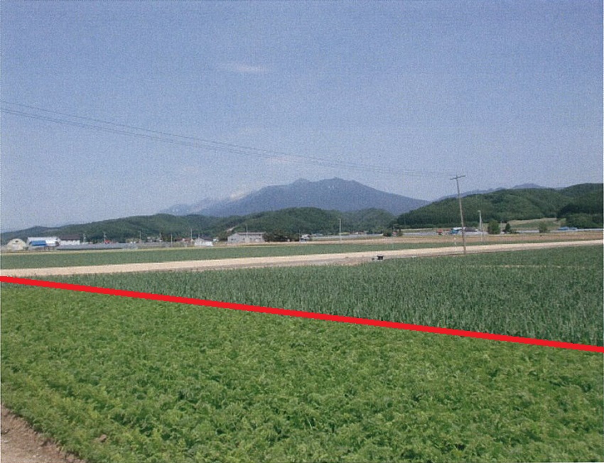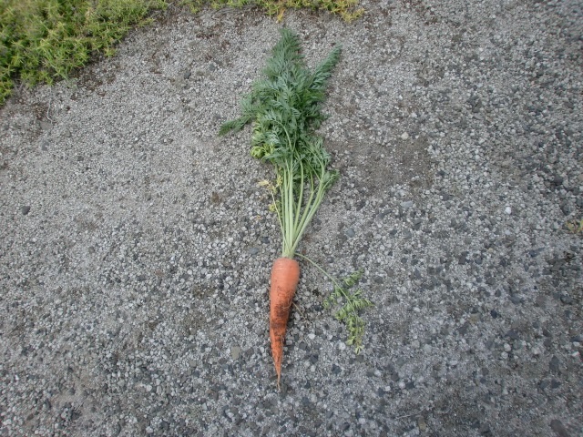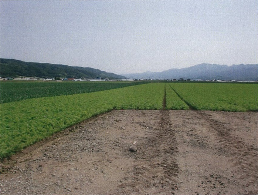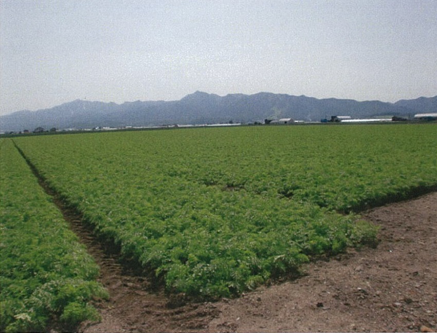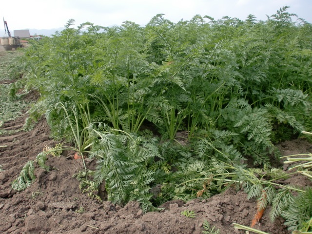 ・4月24日に播種したほ場で生育順調である。 (鳥沼地区、早い時期に播種したほ場、7月下旬出荷見込み) ・1枚目、写真の左側の緑が濃いところはたまねぎのほ場。 ・2枚目、境界線の上がたまねぎ、下がにんじん。 下2枚:上の写真のほ場から抜き取ったにんじん。 ・草丈41cm、根長13cm ・品種:晩抽天翔 | ||||||
