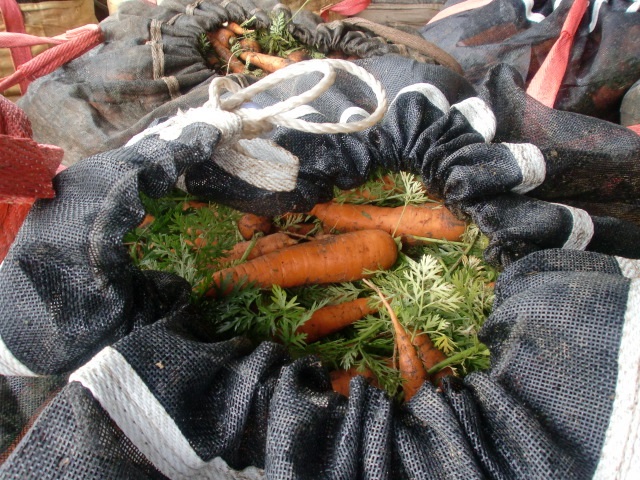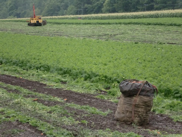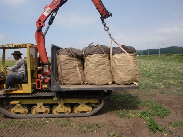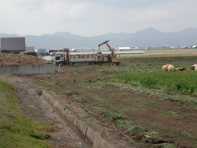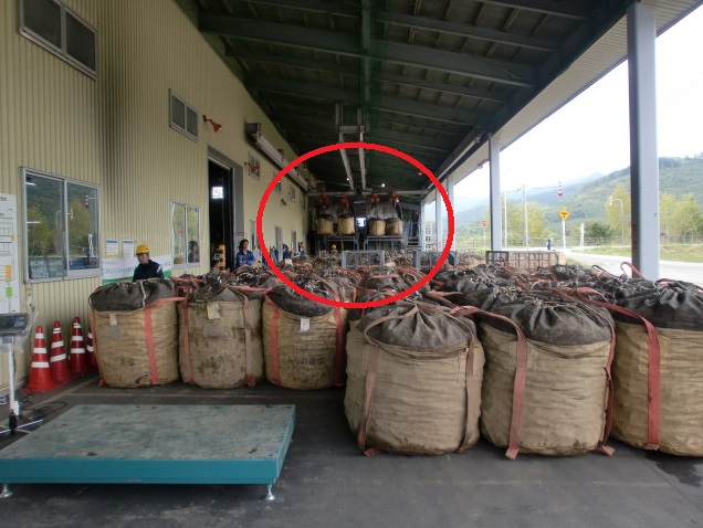 ・幾寅地区、5月上旬に播種したほ場(真空播種機使用)。 ・品種:晩抽天翔、生育は順調。 ・調査日(8月22日)の天候は雨で、降ったりやんだりの天気。 《中下段、下段》 ・選果場に搬入したフレコンに入ったにんじん。 ・この選果場の施設も昨年8月末に浸水する被害にあった。 そのため選果作業が1か月ほど停止し、9月末にようやく再開された。 | ||||||