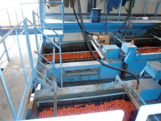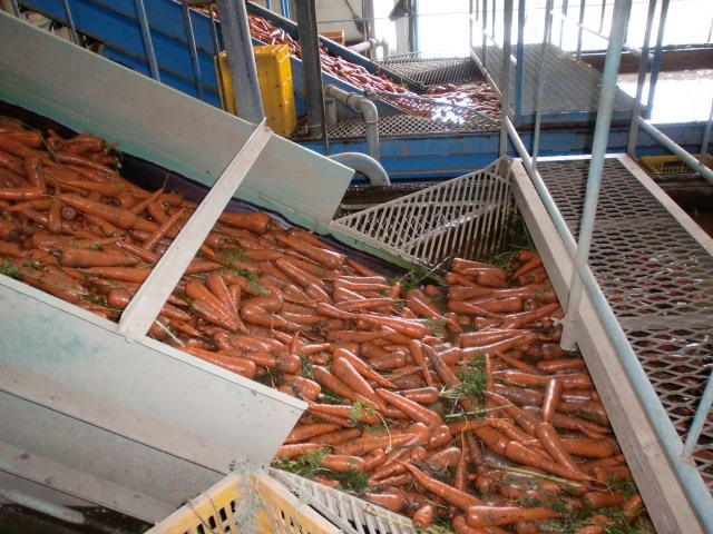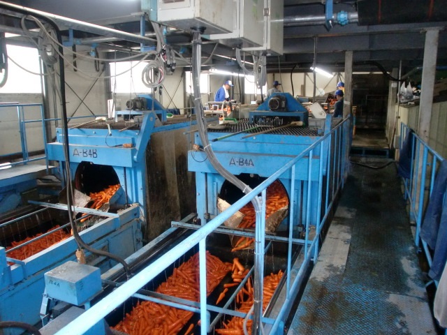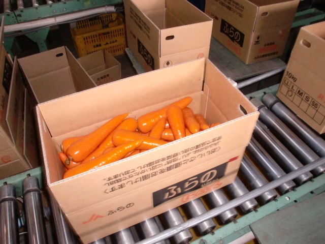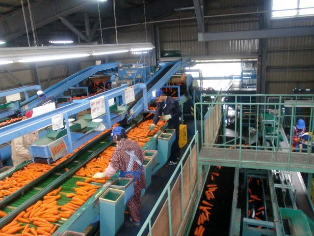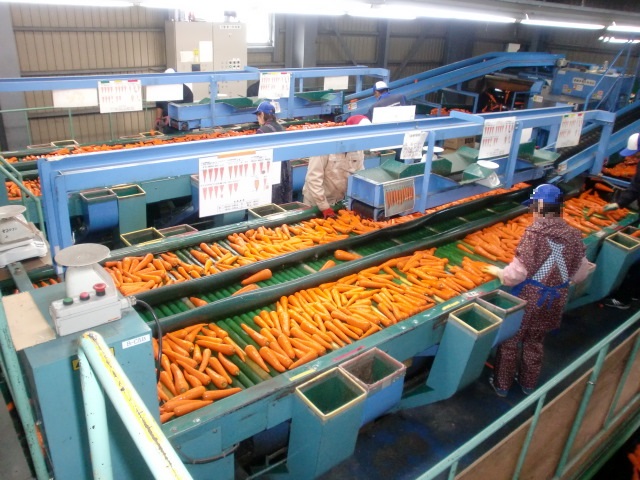 ・1枚目:赤で囲んだ箇所がフレコンをつり上げてにんじんを投入する場所。 ・2枚目:選果する最初の工程。 にんじんが水槽から出てきたところでまだ土がついている様子。 ・3,4枚目:ブラッシングや洗浄の様子。同じような工程が幾つかある。 ・5,6枚目:規格に従い、サイズ・正品・優品・B品等の選別作業をしている。 ・7枚目:最終の計量チェック。 ・8枚目:箱詰めされ上蓋を閉じて選果終了し、 その後予冷され翌日出荷される。 | ||||||