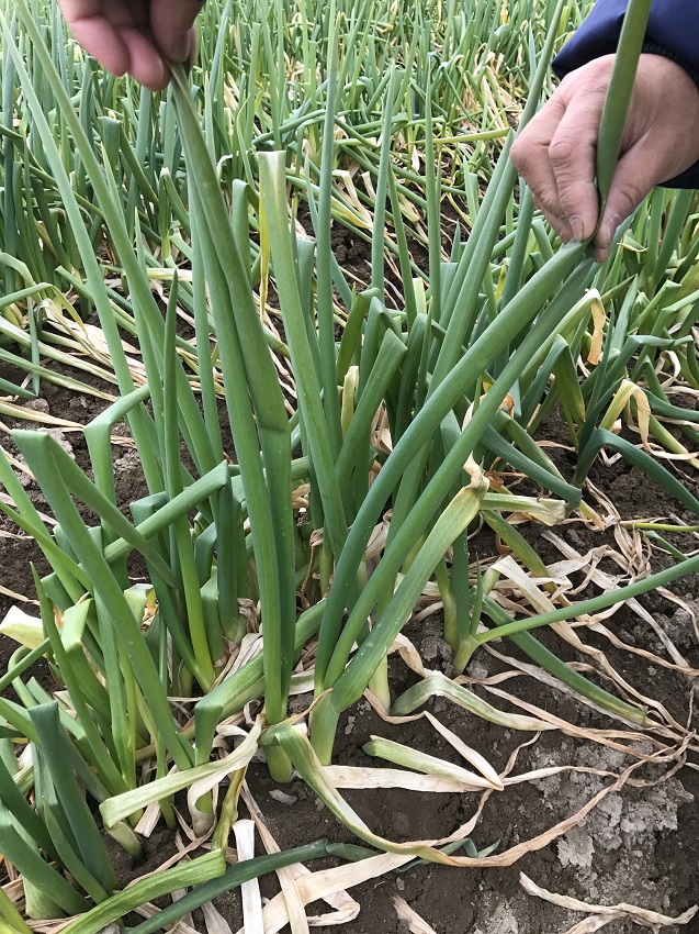 3枚目 :上2枚とは、別のほ場。 4枚目 :倒伏の影響により曲がったねぎ。 5枚目 :ひもを使い、折れないように工夫したほ場。 | ||||||