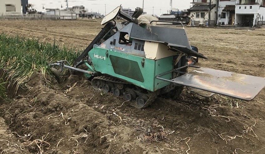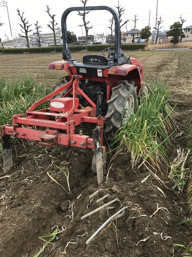 2枚目:分けつ状況(2.5本〜3本で秀品出荷)。 3枚目 :トラクターにアタッチメントを付け、ねぎを掘り起こしている。 4枚目 :1〜3枚の写真とは別のほ場。 5枚目 :ねぎ収穫機。 | ||||||