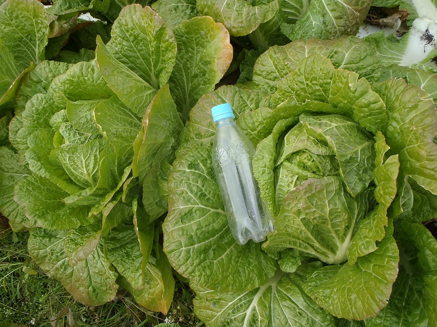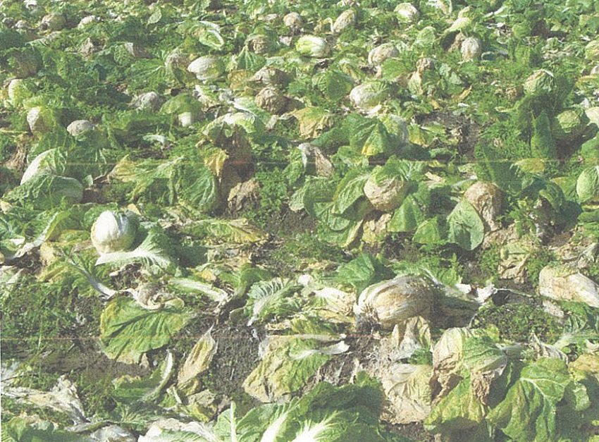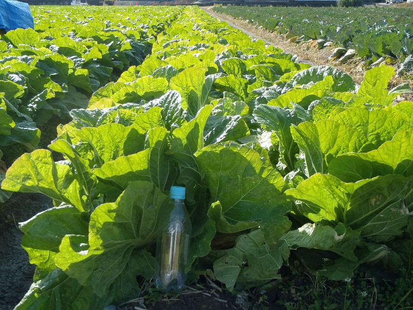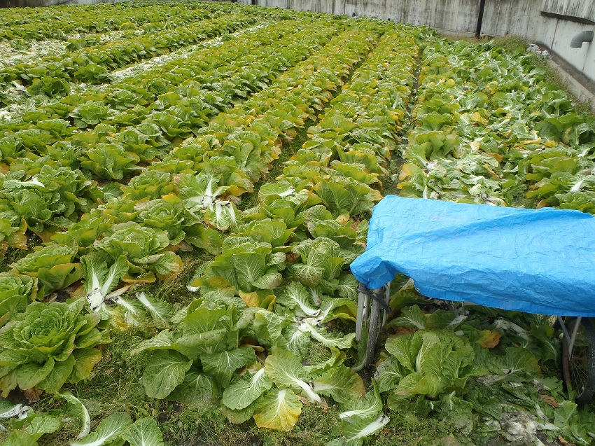 3、4枚目:結束の白菜 ・定植後の暴風(台風)による根傷みと生育期の低温により、 生育不良となり結球不足の球が散見される。 ・定植後は曇りや雨の日が多く、台風で冠水・湿害の被害を受けたため、 軟腐病の発生が懸念されたが適正な防除が行われ、ほぼ発生はみられない。 | ||||||