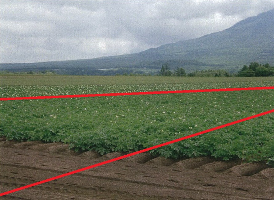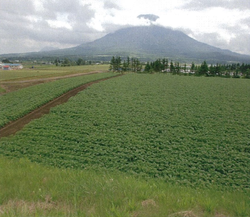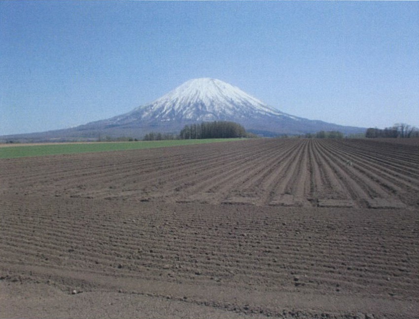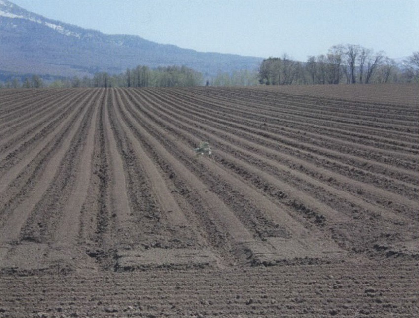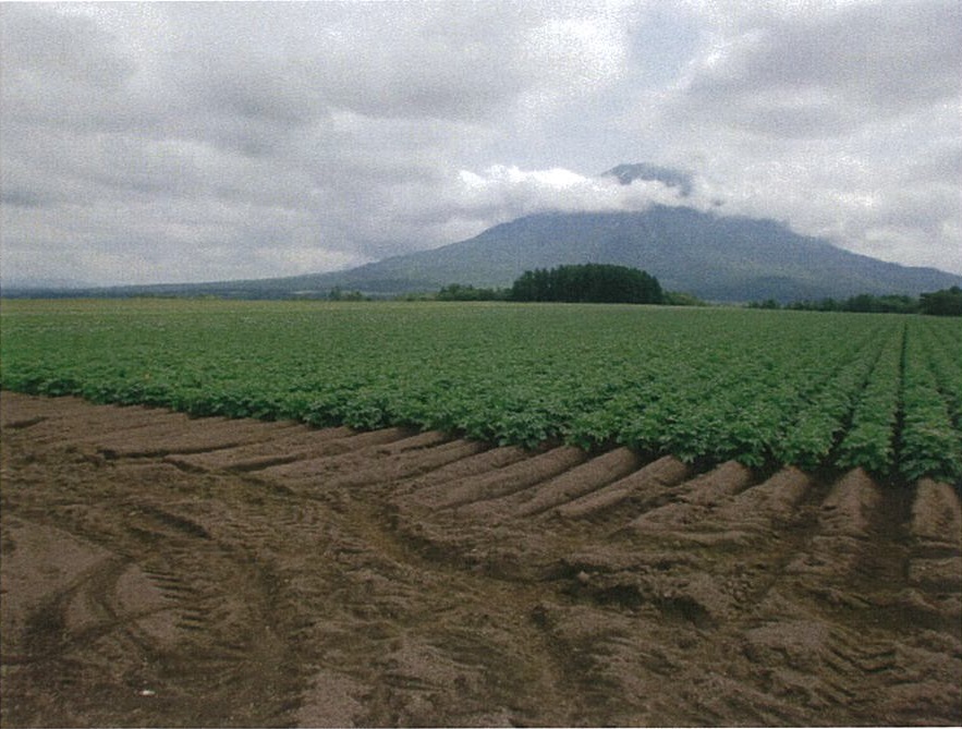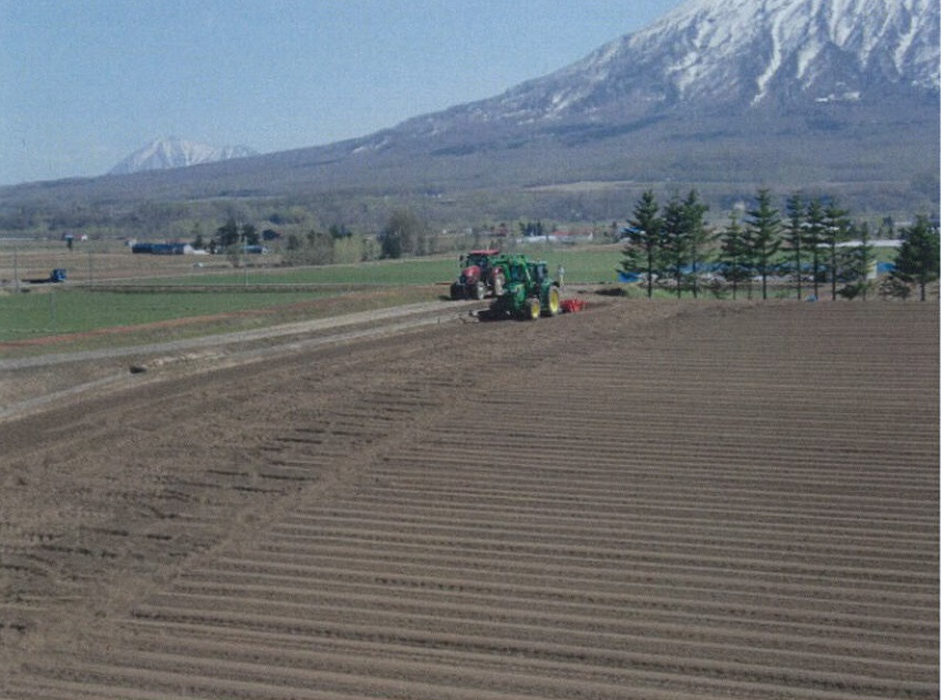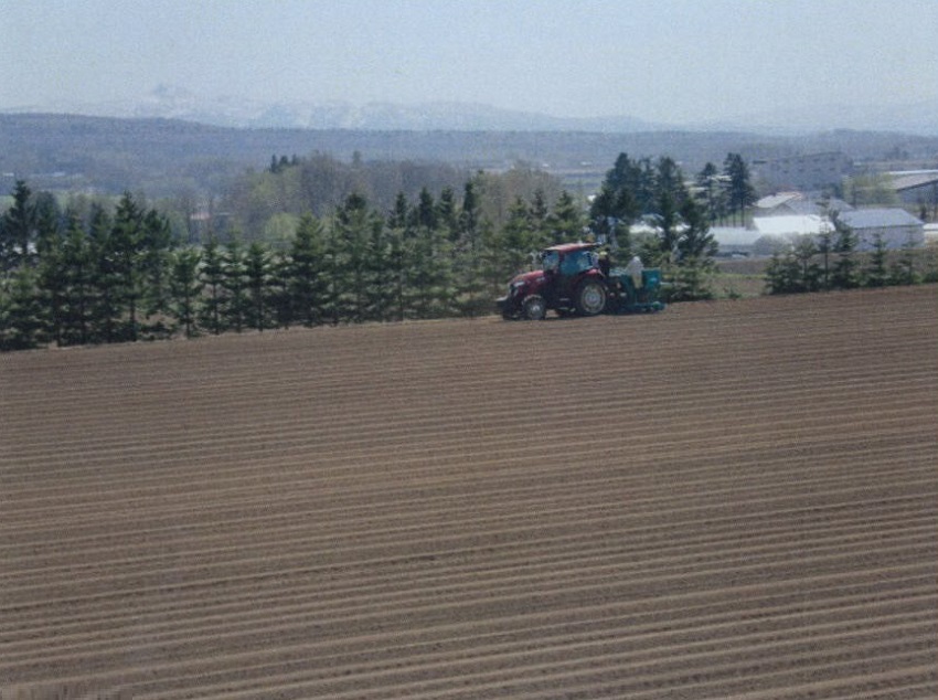 トラクターにポテトプランタという機械を取り付けて 馬齢しょの播種作業を行っている様子。(5/9撮影) 2枚目:ほ場の端(枕)を整地し、その後植え付けを行う。(5/9〜) 上段と同じほ場。 3枚目:左側の畝から、とうや、北かむい、男しゃくと 植付けている(品種の境界線はなし。)。(5/9撮影) 4枚目: 植付け後のほ場で中下段と同じほ場。 |