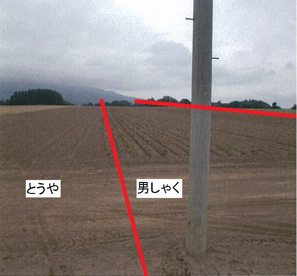 (前回の中下段・下段の写真)。 ・2枚目の境界線の上段が「とうや」、中段が「男しゃく」、下段が「北かむい」。 ・3枚目、4枚目は上段2枚と同一ほ場。 ・3枚目は培土の状況。 ・4枚目は「とうや」の開花の様子。 ・5枚目は前回(5月9日)撮影した播種作業の写真と同じ場所 (前回の上段・中上段の写真)。 |