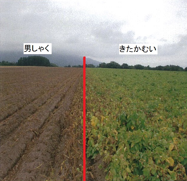1枚目:左は「とうや」を収穫した後のほ場、右は収穫直前の「男しゃく」 (培土された状態のほ場)。 2枚目:1枚目の「男しゃく」のほ場。完全に枯凋し、収穫を待つ。 3枚目:葉のないところが「男しゃく」で、有るところが「きたかむい」。 4枚目:大コンに入った「とうや」。乾燥も十分で皮ムケなく品質良好。 5枚目:選果され、10kgダンボールに入った「とうや」。 |
