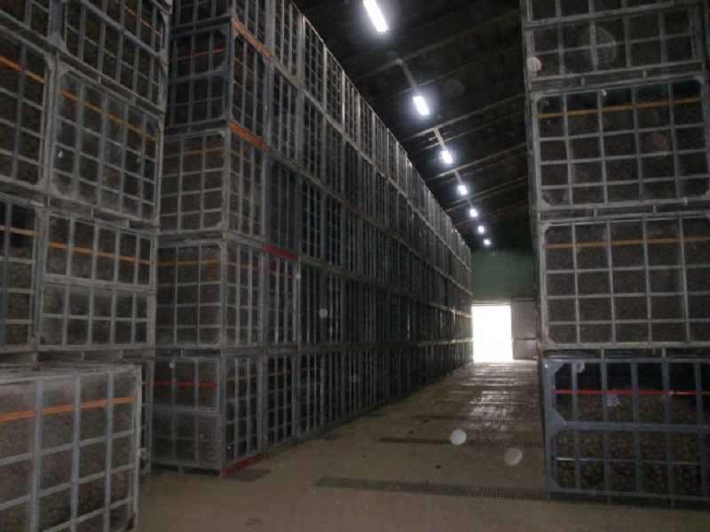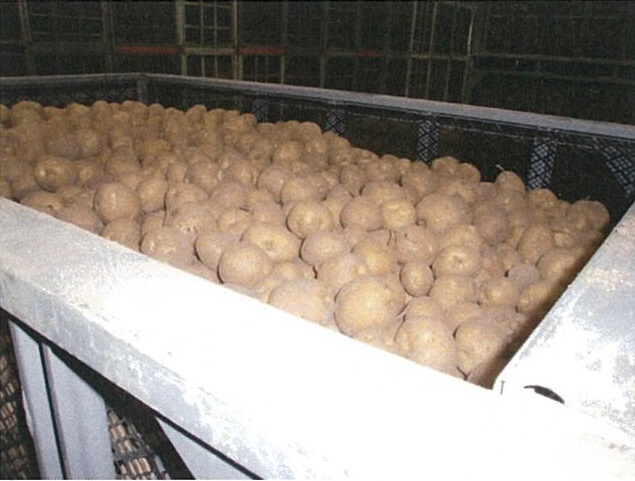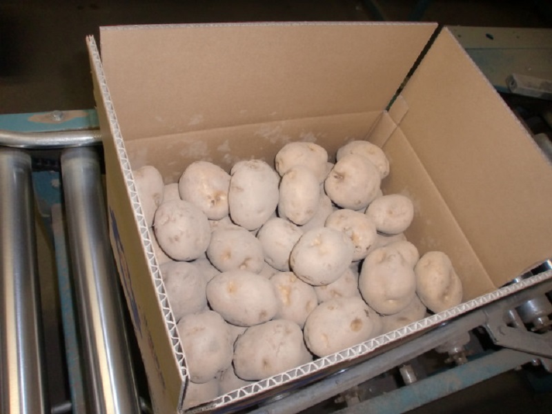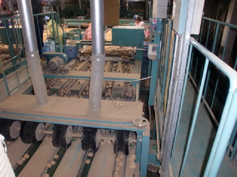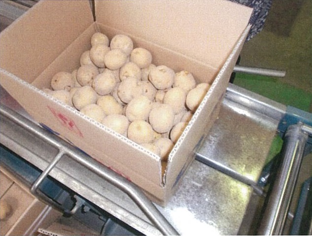 1枚目:選果作業のスタート場所。 ばれいしょの入った大コンを傾けている。 2枚目:選果ライン。不良品(腐れ等)を除去している。 3枚目:10kgダンボールに入った「男しゃく」(L規格)。 乾燥も充分で品質良好。 4枚目:20kg紙袋に入った「男しゃく」(加工向け、M規格)。 5枚目:大コンに入った状態で貯蔵庫に保管している。 6枚目:選果され10kgダンボールに入った正品の保管状況。 |