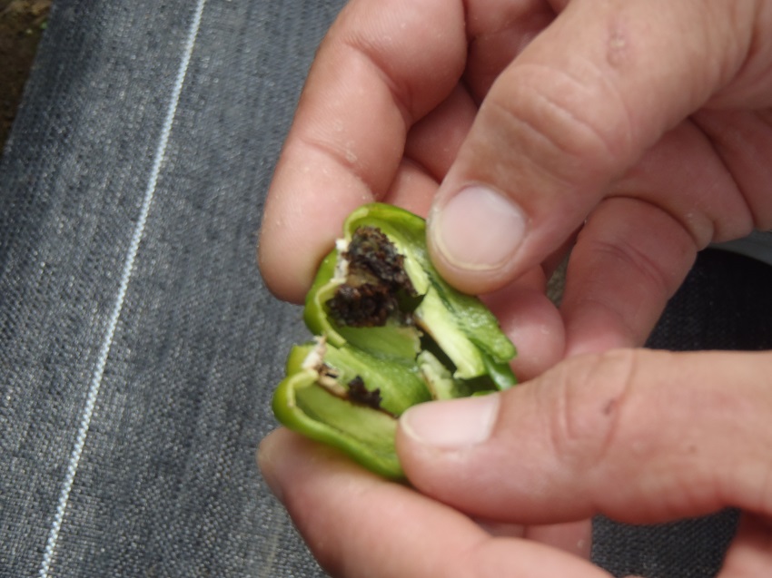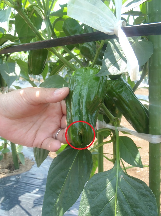 7月に入り気温が上昇、日照時間も増加したことから生育状況は好転。 しかし、着果量の急激な増加に収穫作業が追いつかない生産者もおり、 採り遅れが今後の出荷量に影響する可能性がある。 ・突然の局地的に大雨が降ることが月に何度かあり、生産者から 薬剤散布等病害虫の防除作業のタイミングが難しいとの声があった。 ・3枚目:タバコガの被害果。発生は少ない。 ・4枚目:アザミウマがみられた。 | ||||||