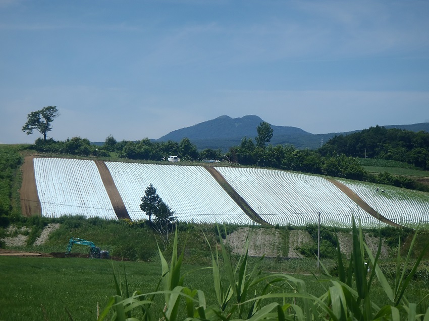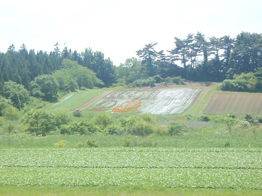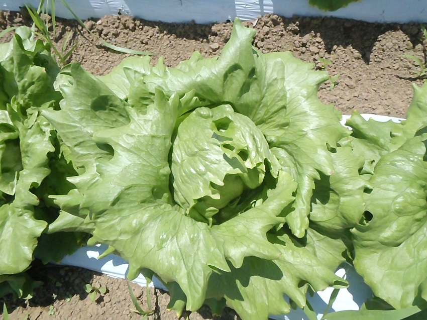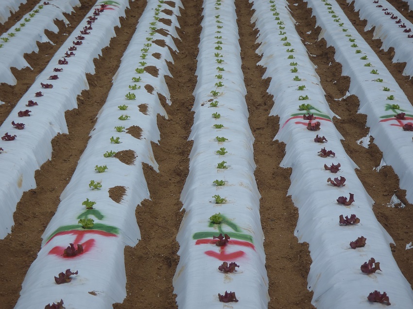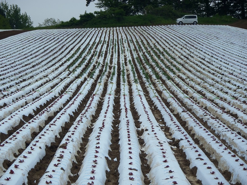 高めの日(28〜29℃)が多いため、生育速度は若干早めに進んでいる。 ・今年も恒例となっているレタスアートの定植が、 奥中山レタス専門部によって5月25日に行われた。 グリーンとパープルの非結球レタスとマリーゴールドの花の構成は、 地元の小中学生がデザインをした。 どんなレタスアートができるかは、見頃を迎えるまでの お楽しみとなっている。 ・上段:ほ場は乾燥気味だがマルチ内は水分あり。 ・中上段:4月下旬に定植したほ場。6月上旬に出荷開始予定。 ・中下段、下段:恒例のレタスアート。6月下旬から見頃に。 | ||||||