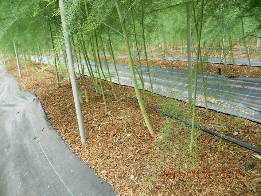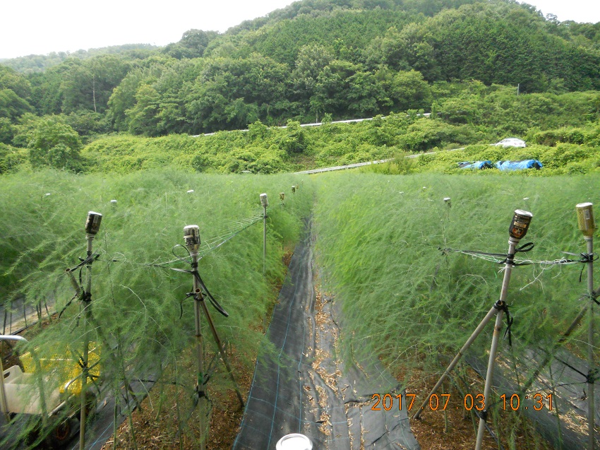 ・中上段 :立茎の状況。病害虫は見えない。 140cm程度で芯止めをしている。 ・中下段 :立茎中の個体。株元の状況。 ・下 段 :同上、発生状況がばらついている。 | ||||||