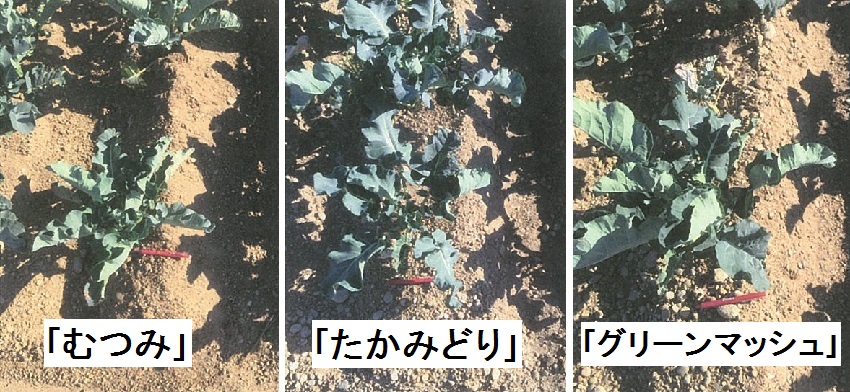1枚目:ほ場全景(1つのほ場で3品種植えられている)。 2枚目:品種は左から「むつみ」「たかみどり」「グリーンマッシュ」。 3枚目:根が枯れ、成長が止まったり枯れてしまったブロッコリー。 | ||||||