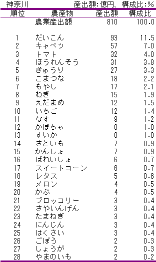 神奈川県における野菜の産出額の順位
