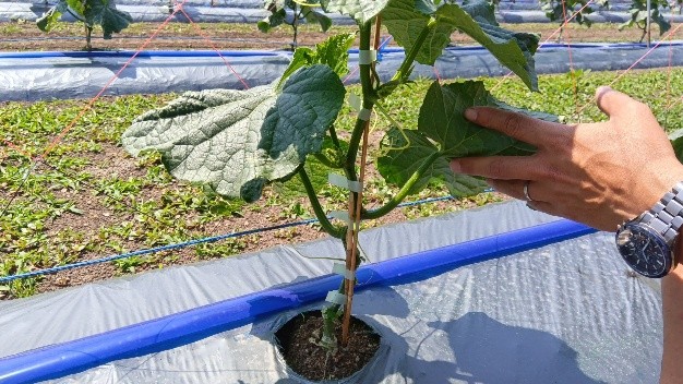 7月は高温・多照により芯焼けが多く発生したため、側枝が多く込みあっており整枝が遅れている。また、ハウスの天井が混雑し風通しが悪くなっていることから、今後の出荷量確保に向けて整枝と摘葉による風通しを確保するよう呼び掛けている。